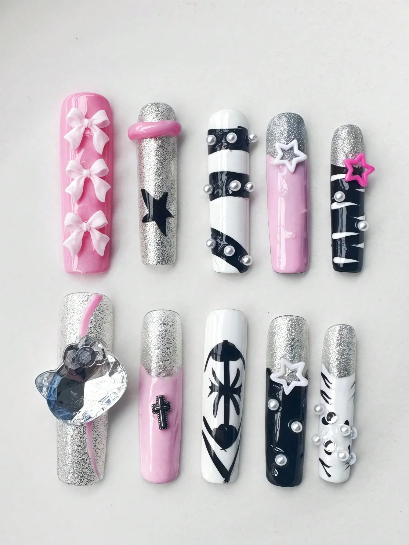 Grunge Punk Kawaii Y2K Pink 3D Bow, Punk Rivets, Stripe, Metal Cross, French Romantic Heart, Playful Multi-Color Star, Long Square Nail Tips, Handmade False Nails, Suitable For Music Festivals/Parties