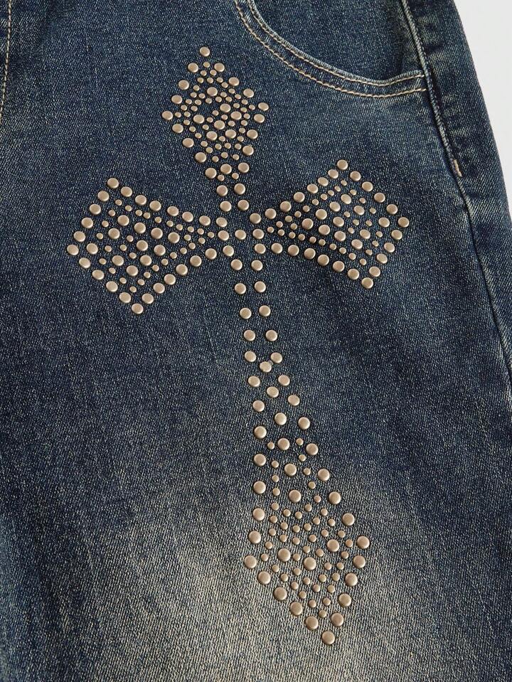 Grunge Punk Kpop Gyaru Shibuya-Style Cross Metal Rivet Distressed Skinny Flare Low Waist Jeans For Women