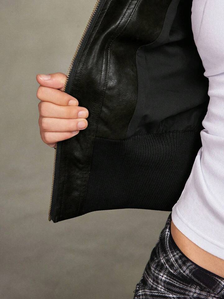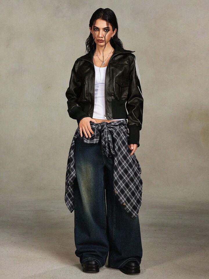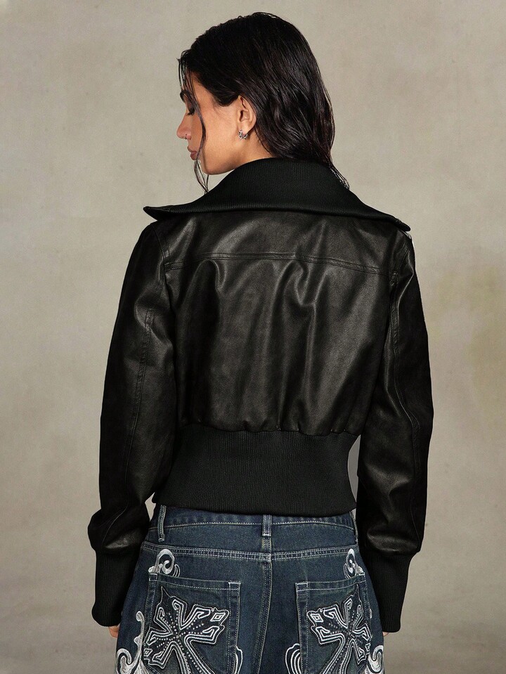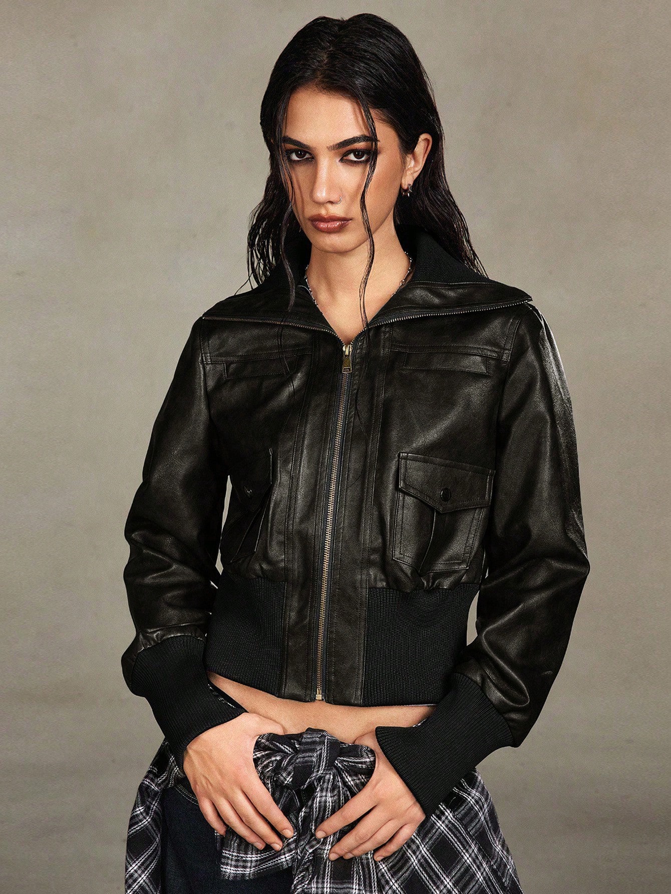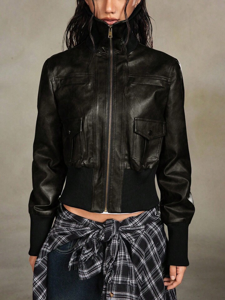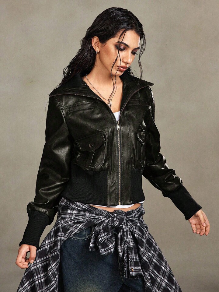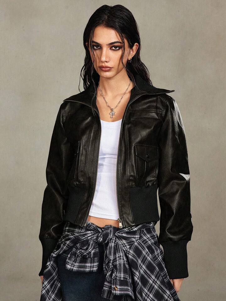 Grunge Punk Kpop Vintage Street-Style Distressed PU Biker Jacket For Women