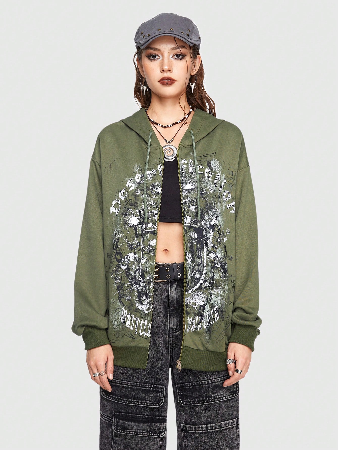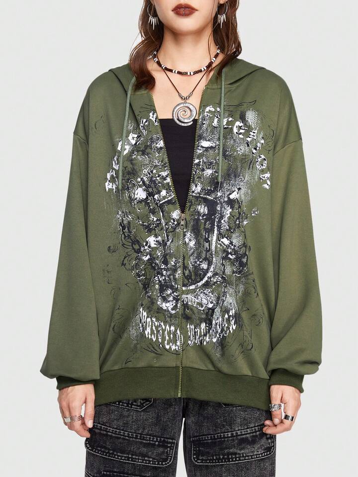 Grunge Punk Letter Graphic Zip Up Drawstring Hoodie