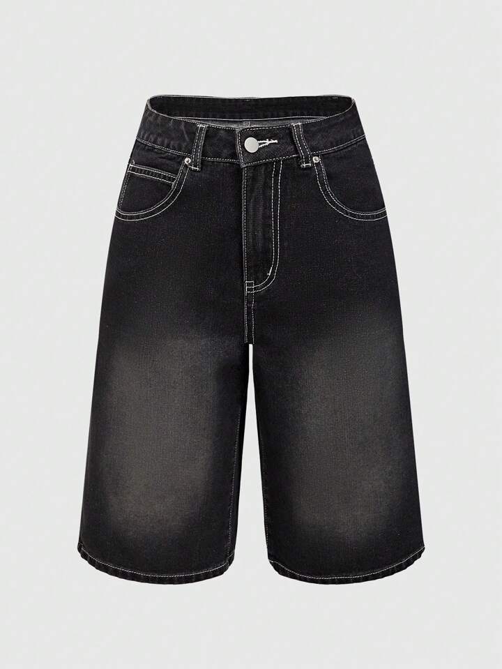 Grunge Punk Loose-Fitting Vintage Washed Denim Shorts With Punk Street Style Embroidered Skull & Wings, School