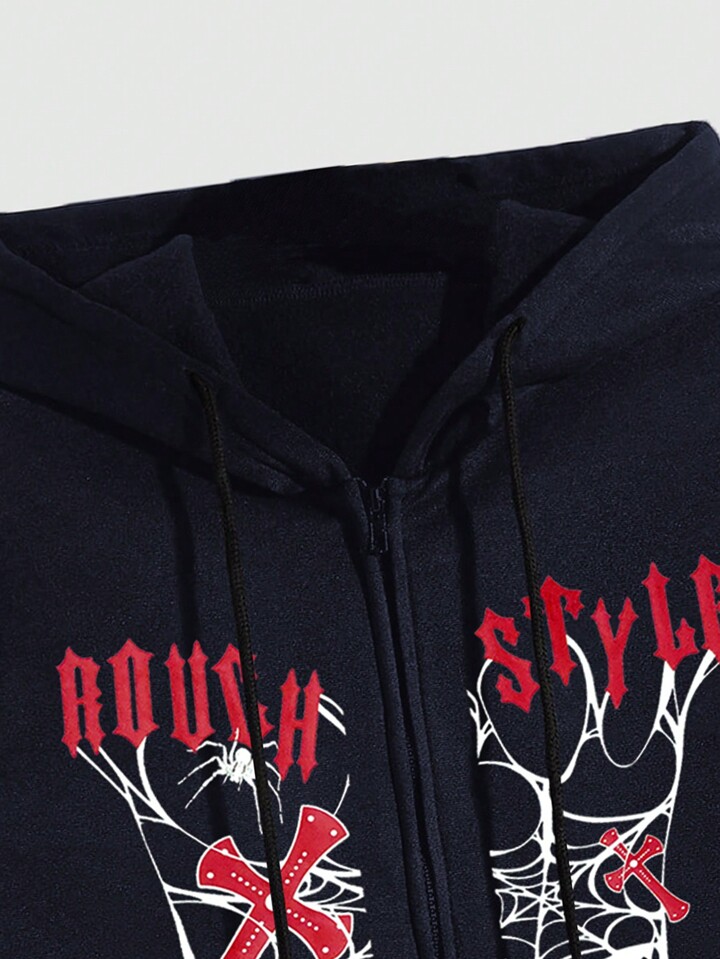 Grunge Punk Men Letter & Figure Graphic Zip Up Drawstring Thermal Lined Hoodie