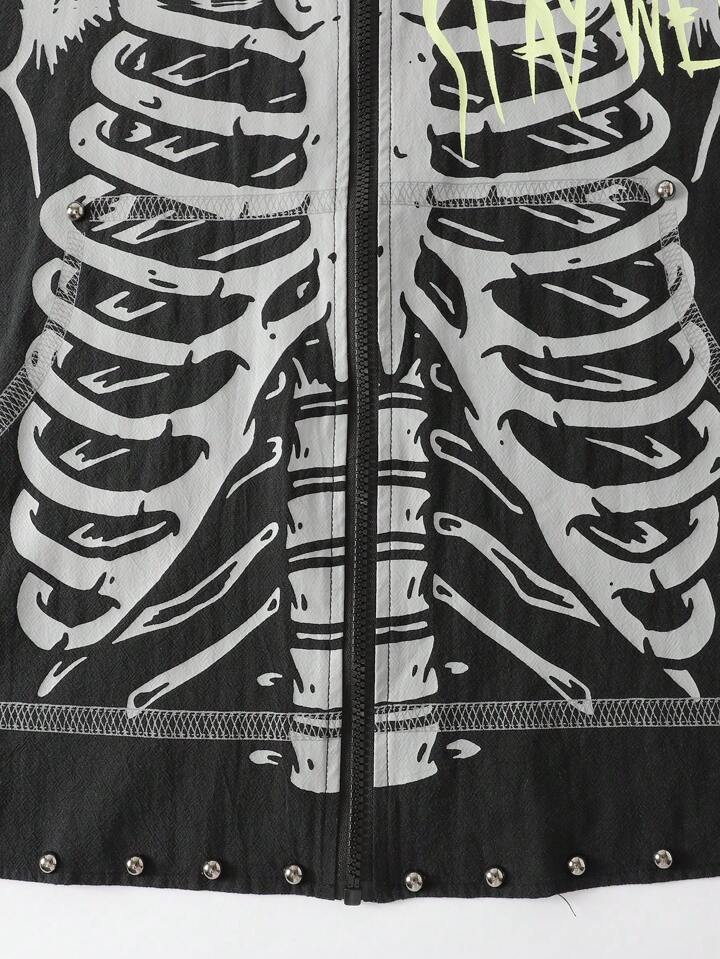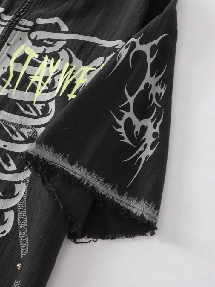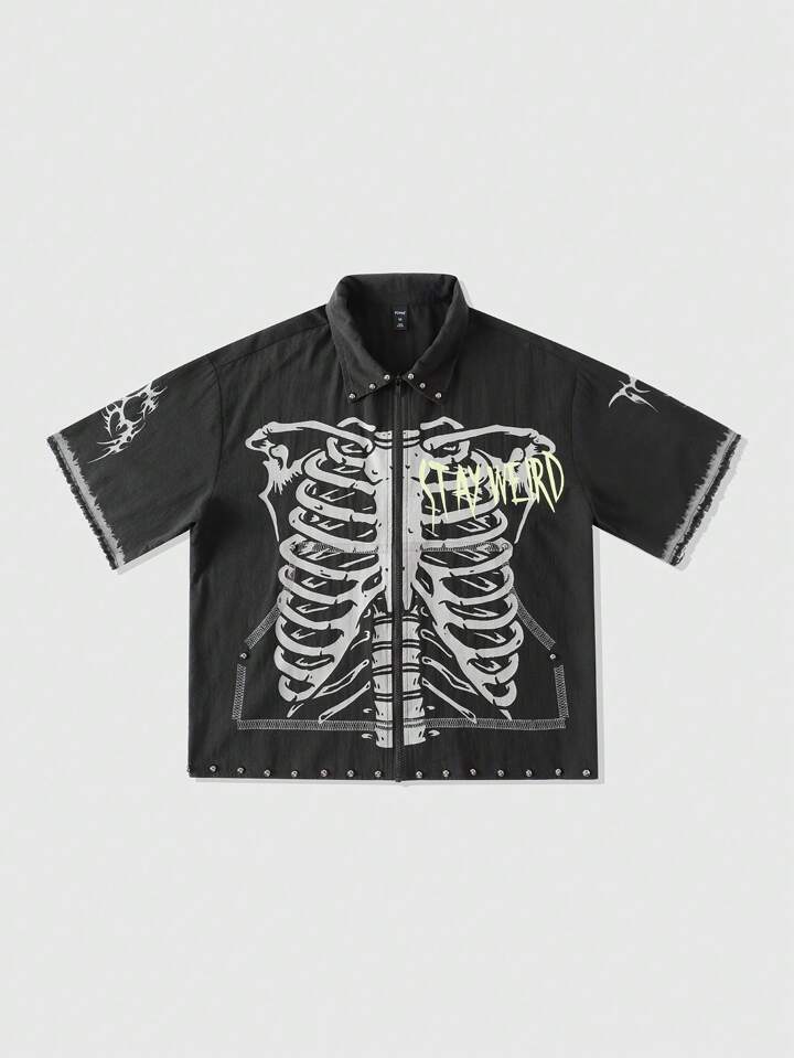 Grunge Punk Men's Boxy Fit Skull Print Rhinestone Embellished Short Sleeve Shirt