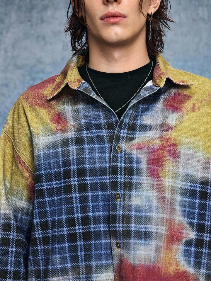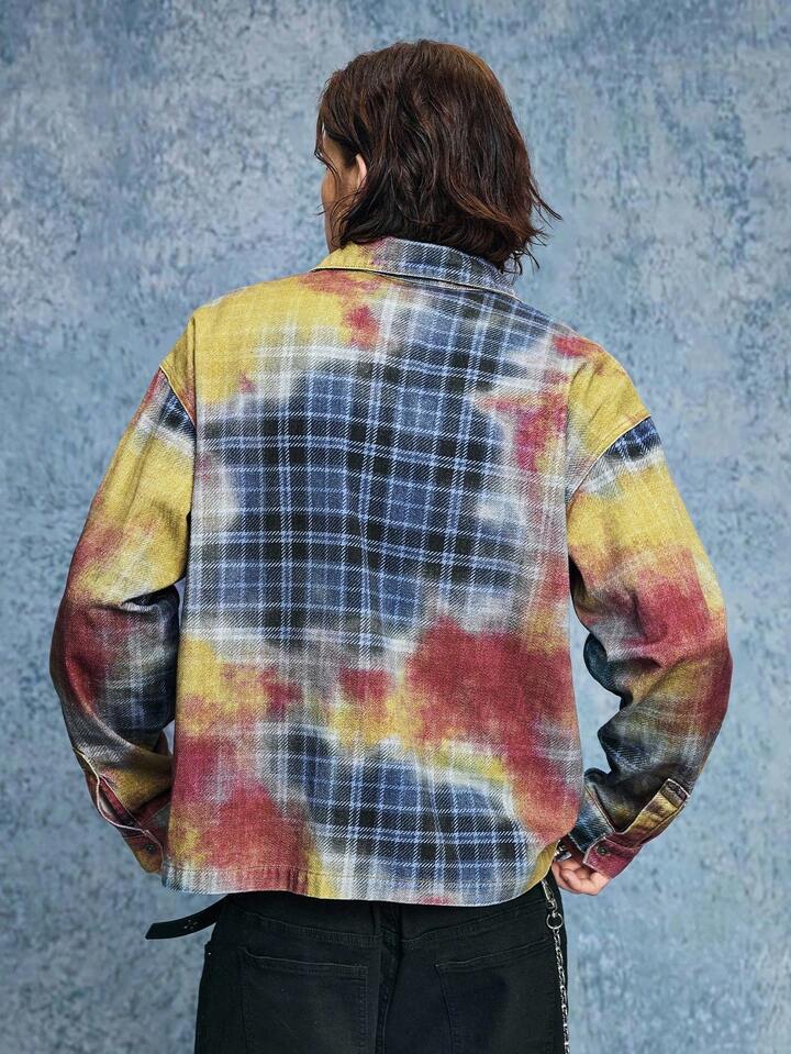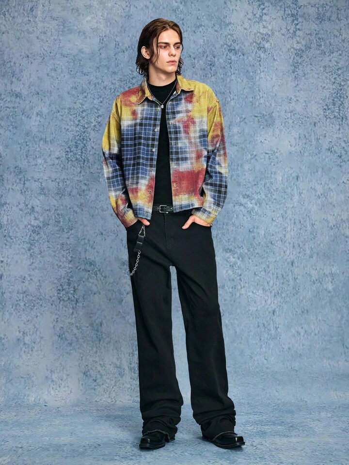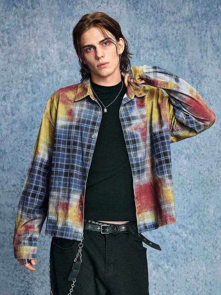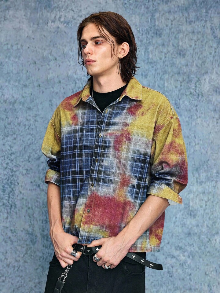 Grunge Punk Men's Casual Patchwork Plaid Button-Up Denim Shirt, Autumn