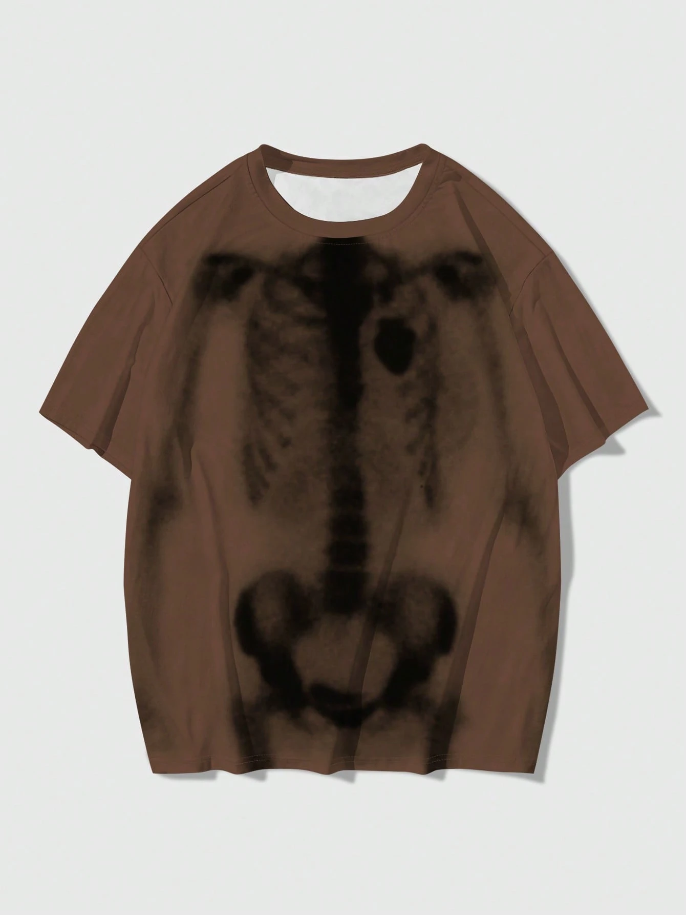 Grunge Punk Men's Casual Skull Skeleton Print Round Neck Short Sleeve T-Shirt, Summer