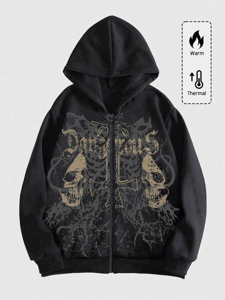 Grunge Punk Men's Skull Letter Print Zip Up Hoodie With Long Sleeve, School, Fall/Winter