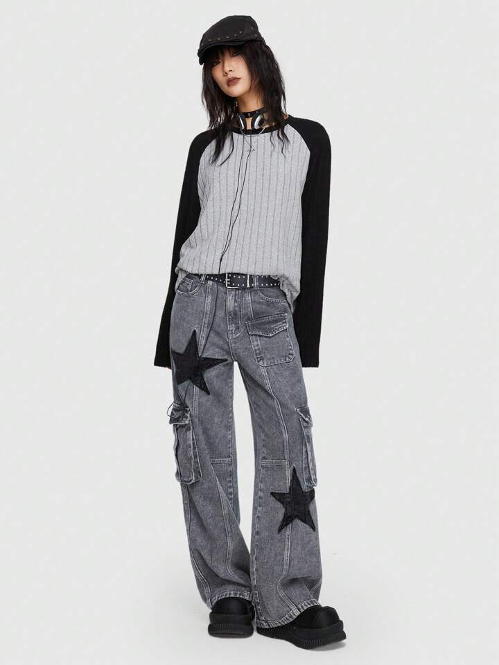 Grunge Punk Multi-Pocket Cargo Jeans With Stars Patch