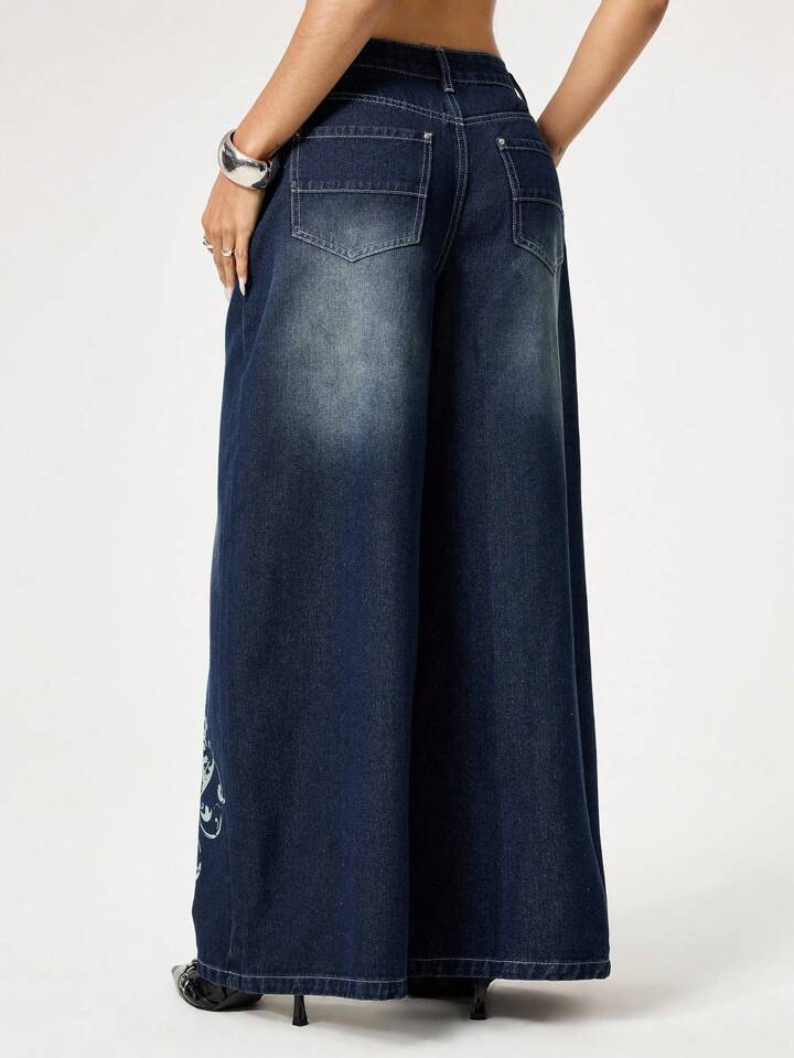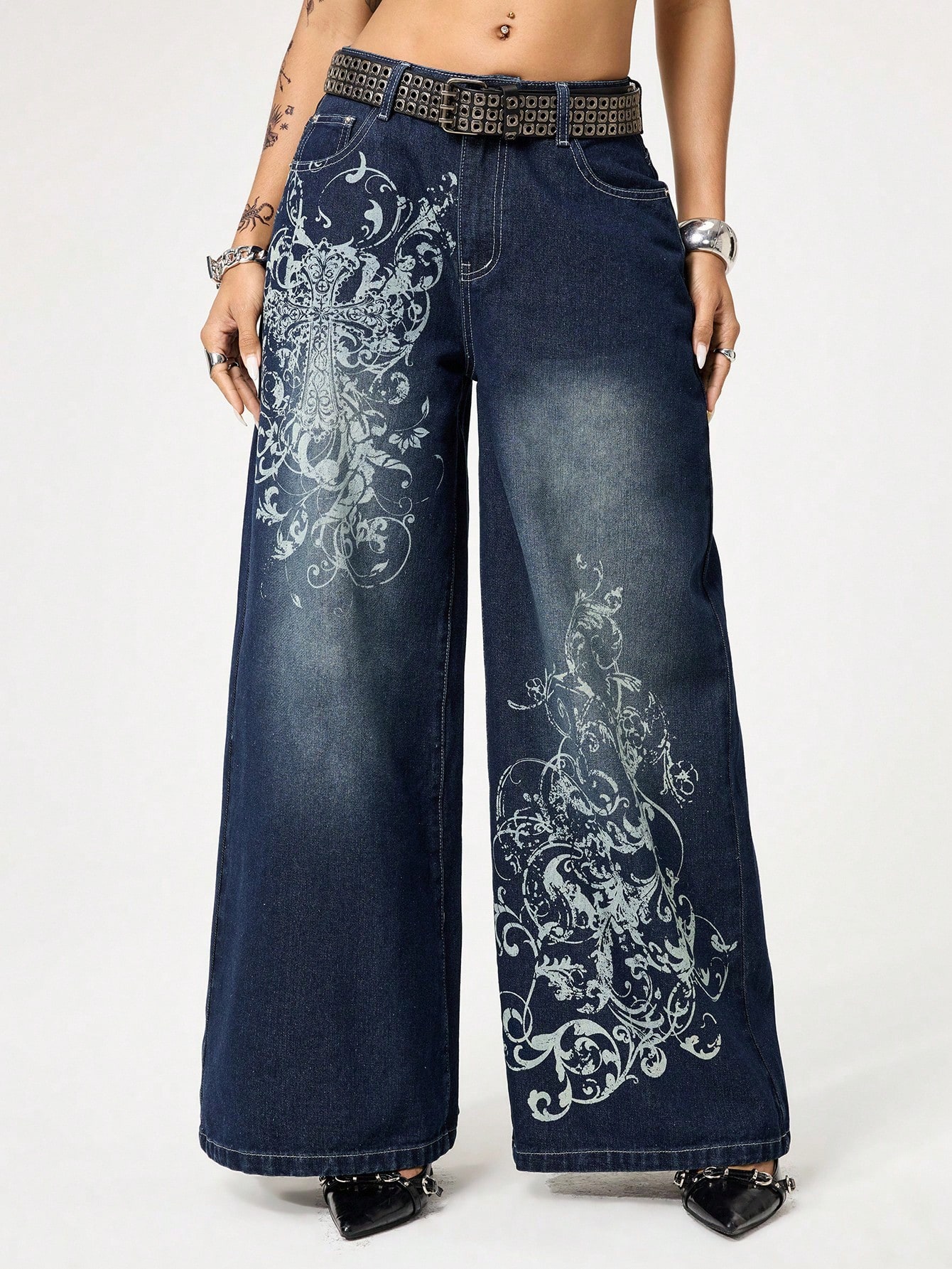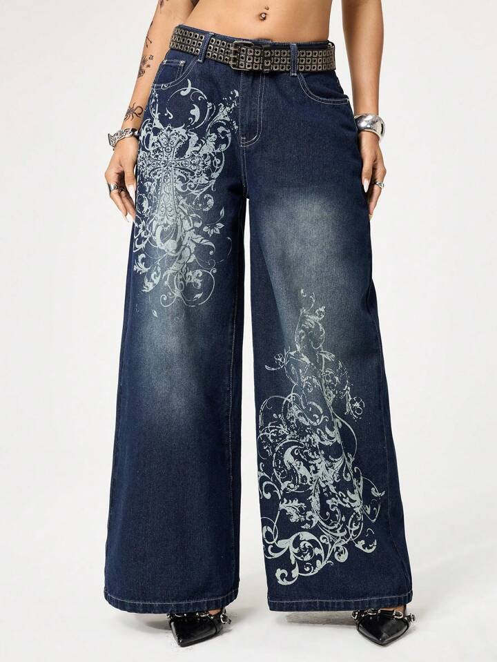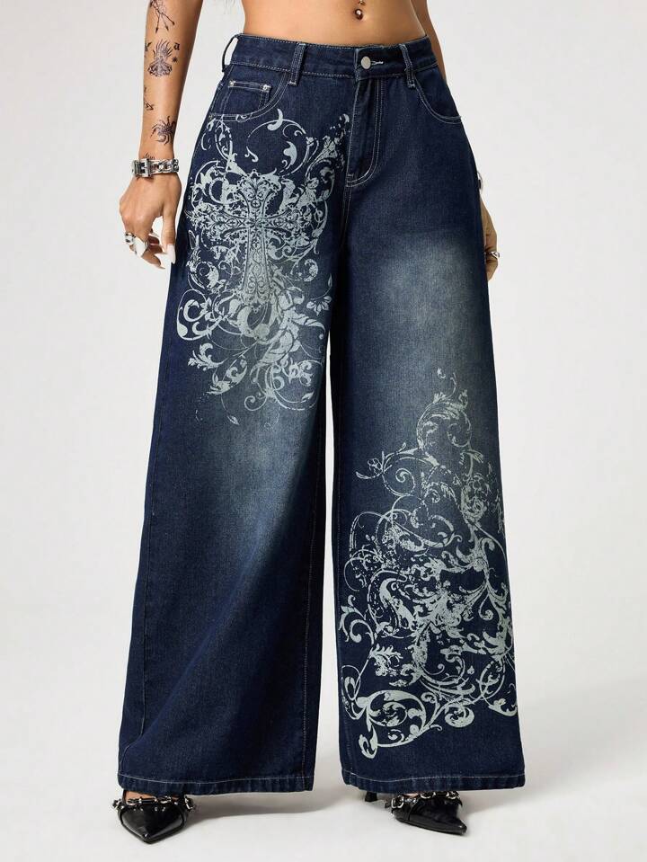 Grunge Punk Oversized Street Grunge Distressed Vintage Cross & Vine Print Loose Fit Women Jeans