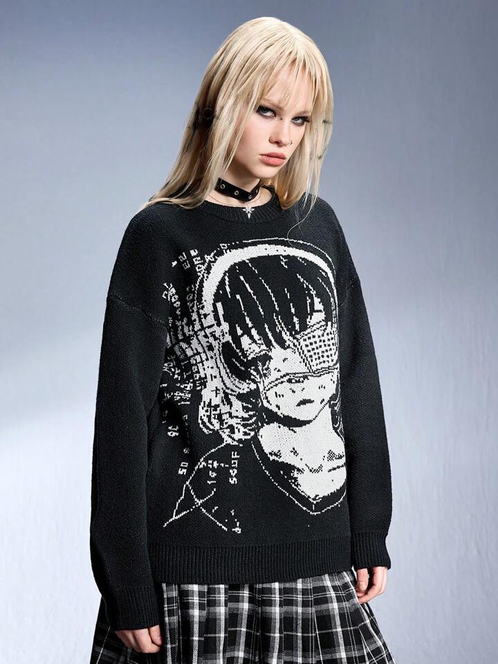 Grunge Punk Oversized Y3K Grunge Girl Portrait Intarsia Pullover Sweater