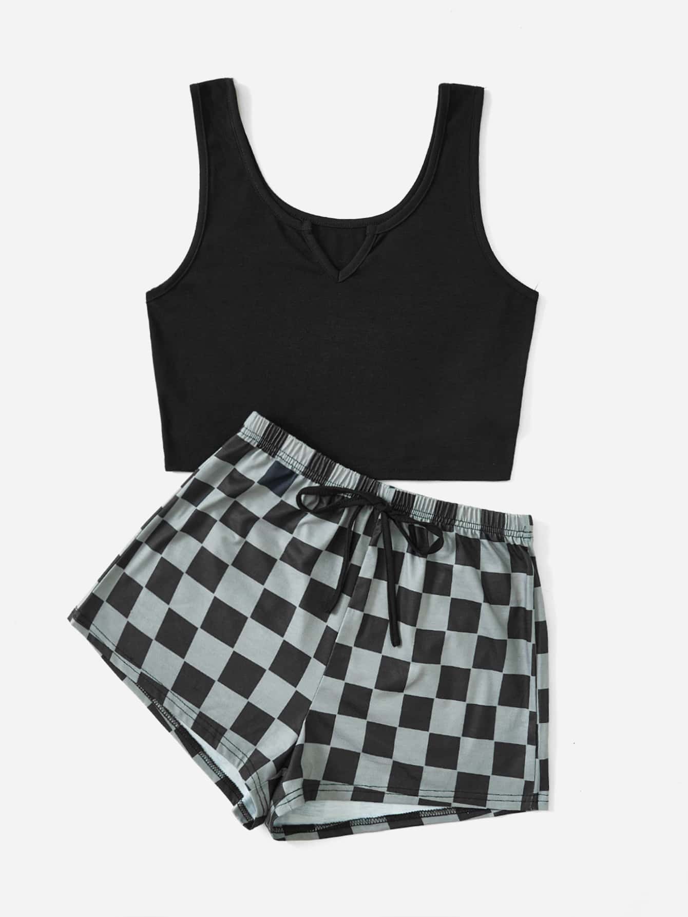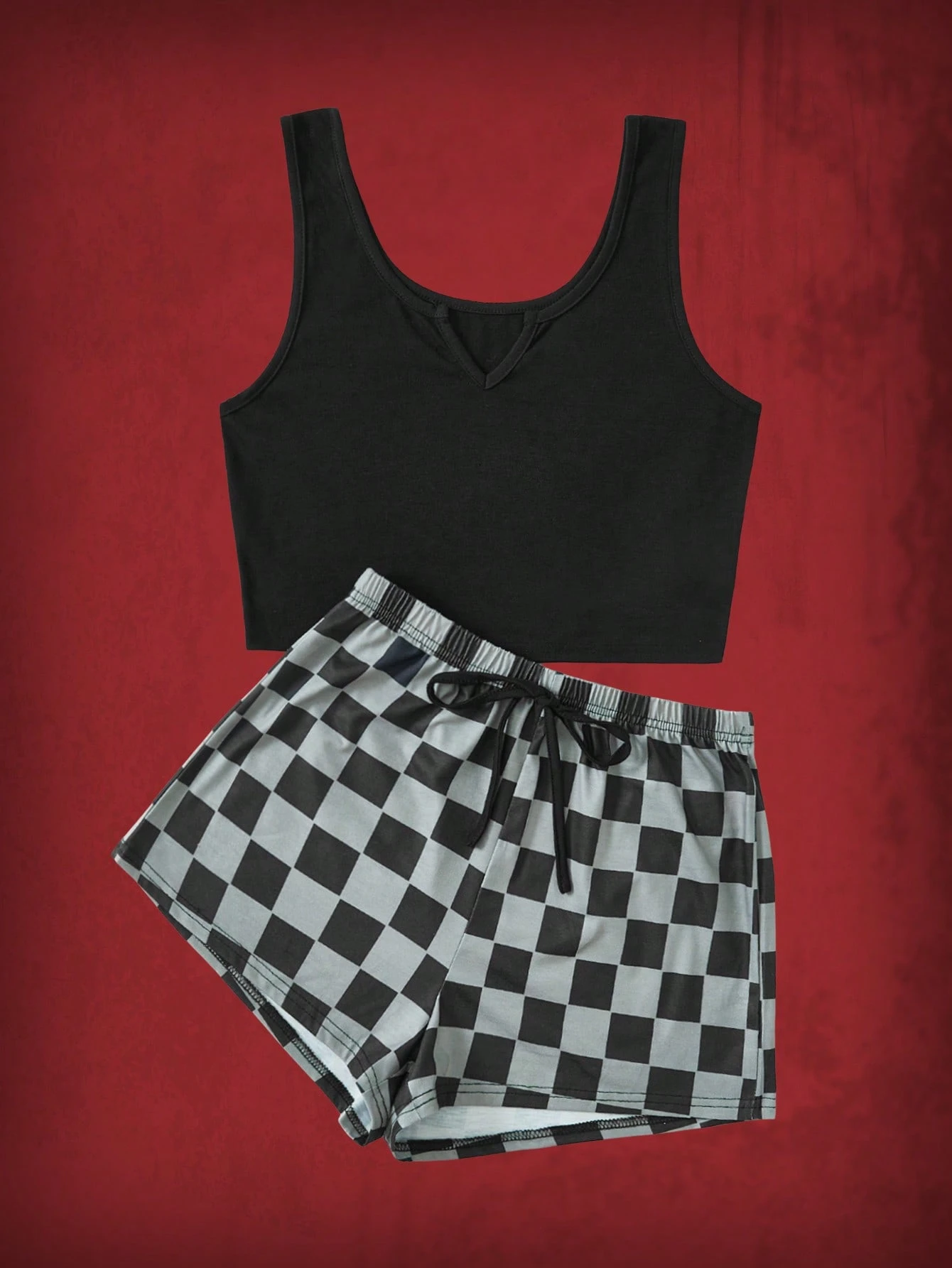 Grunge Punk Plaid Print Notched Neck Lounge Set