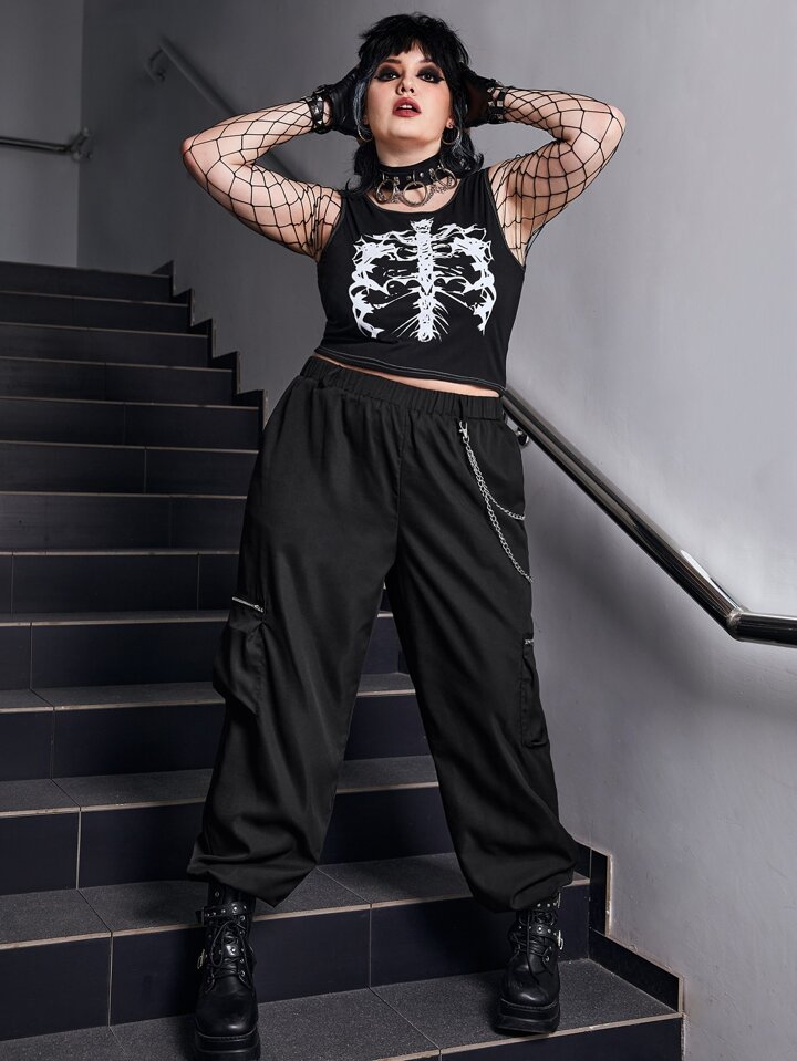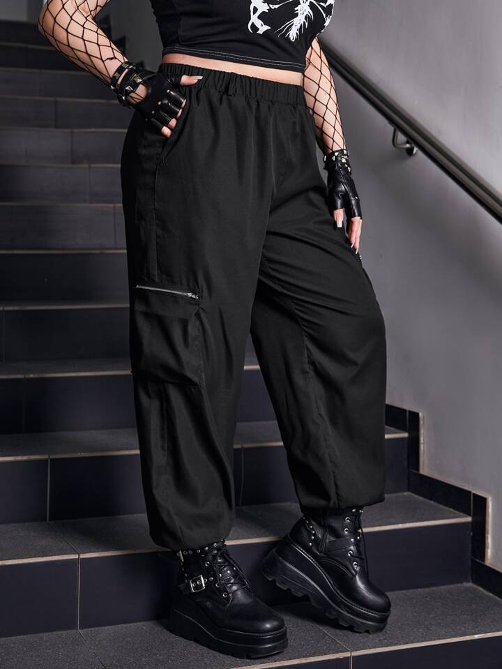 Grunge Punk Plus Chain Detail Zip Pocket Side Cargo Pants