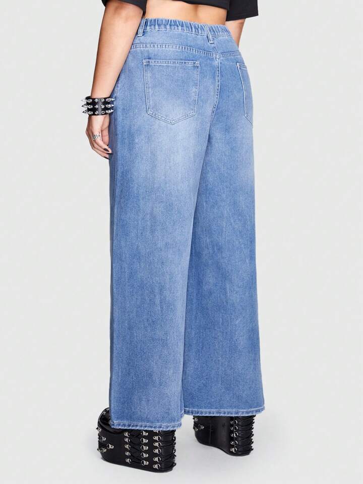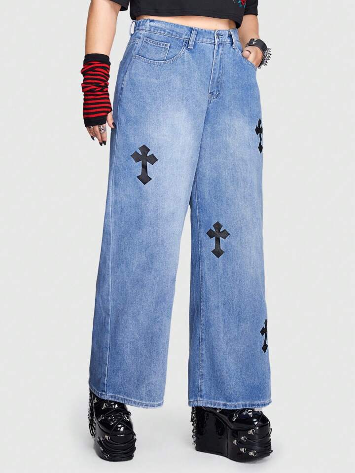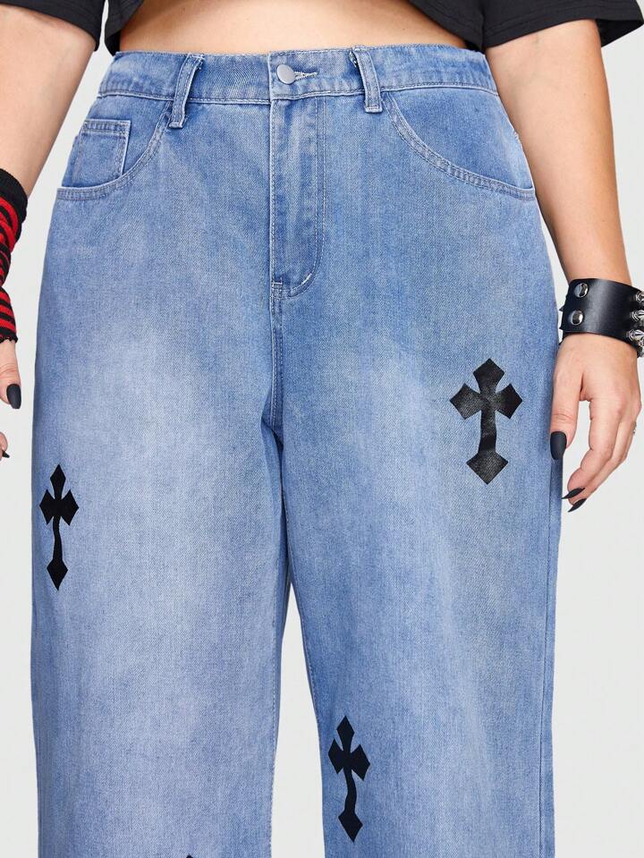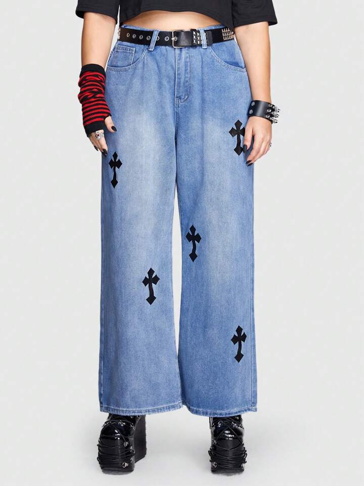 Grunge Punk Plus Cross Print Wide Leg Jeans