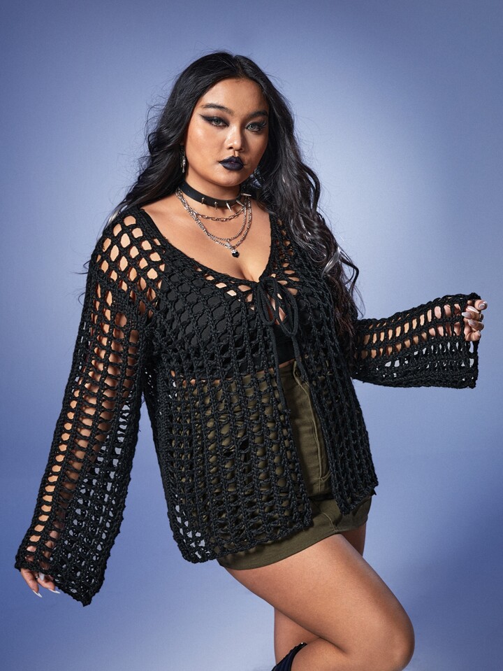 Grunge Punk Plus Hollow Out Tie Front Cardigan