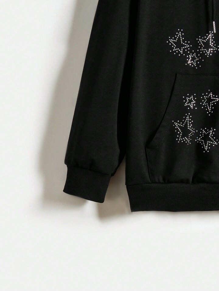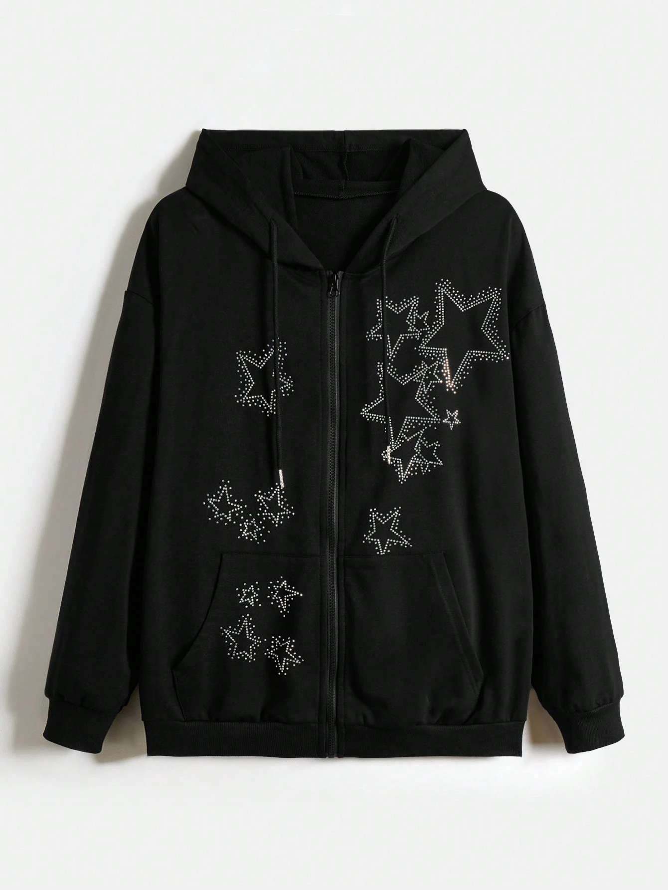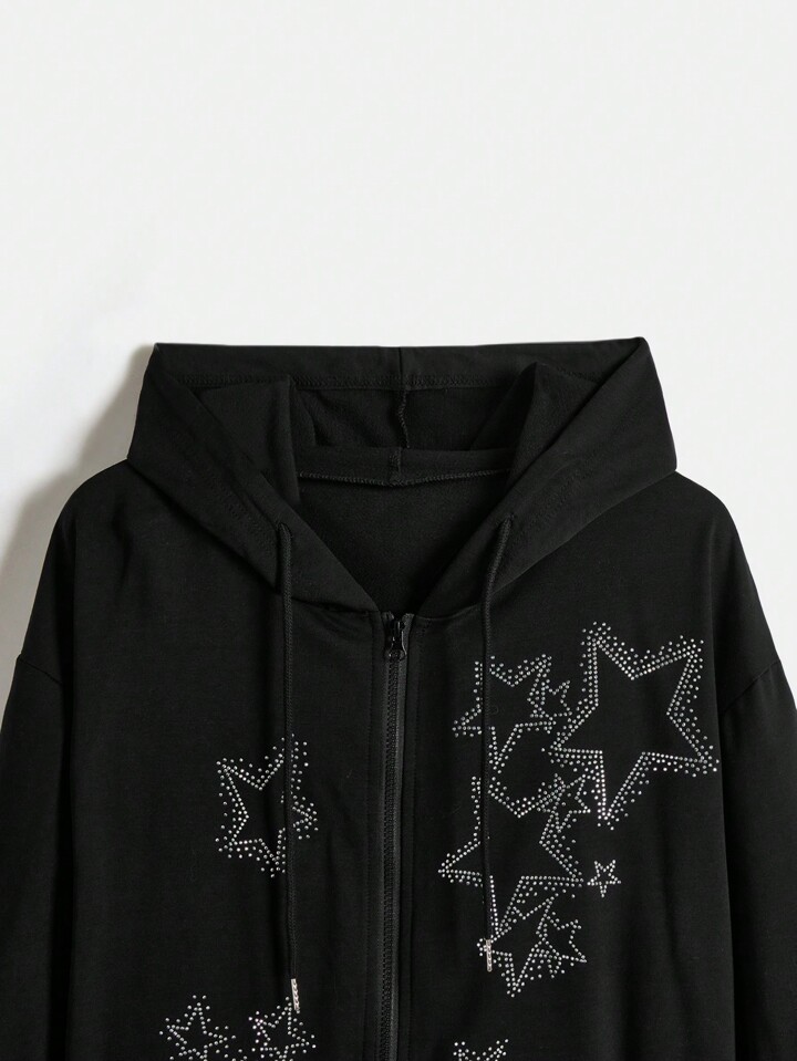 Grunge Punk Plus Size Hooded Sweatshirt With Star Pattern And Rhinestones, Zipper Closure