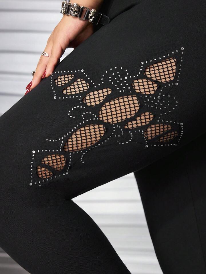 Grunge Punk Plus Size Punk Rhinestone Cross Hollow Fishnet Patchwork Leggings
