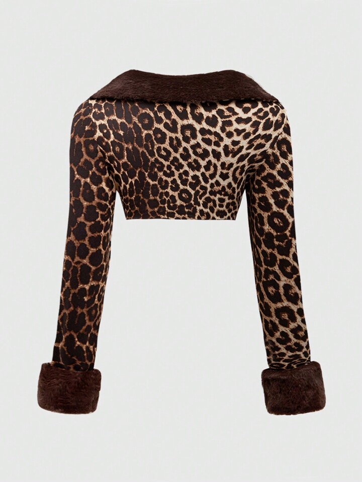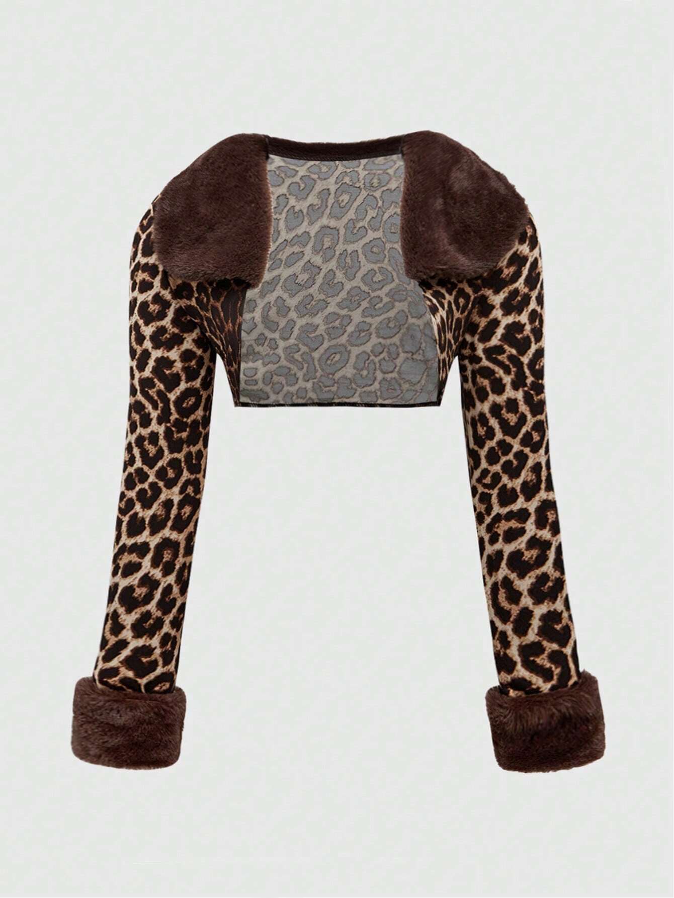 Grunge Punk Plus Size Sexy Extra Cropped Y2K Gyaru Skin-Tight Leopard Print Patchwork Furry Collar Top