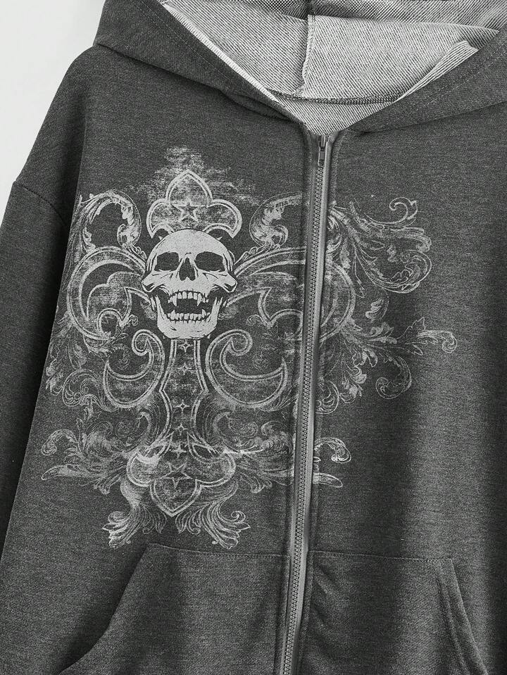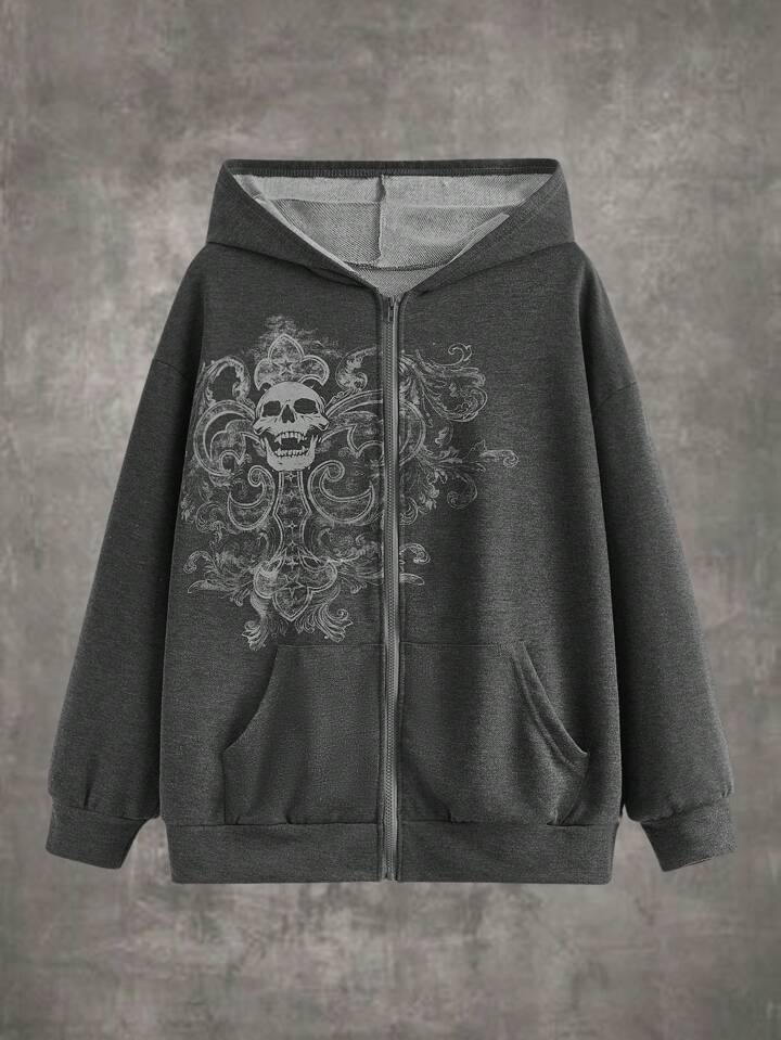 Grunge Punk Plus Size Skull & Kangaroo Printed Zipper Hoodie