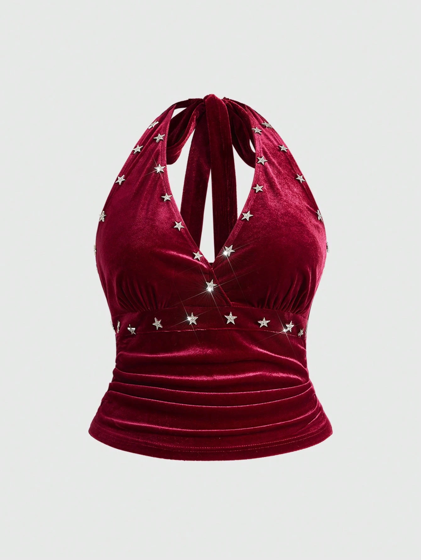 Grunge Punk Plus Size Vintage Velvet Burgundy Punk Star Top, Autumn/Winter/Christmas