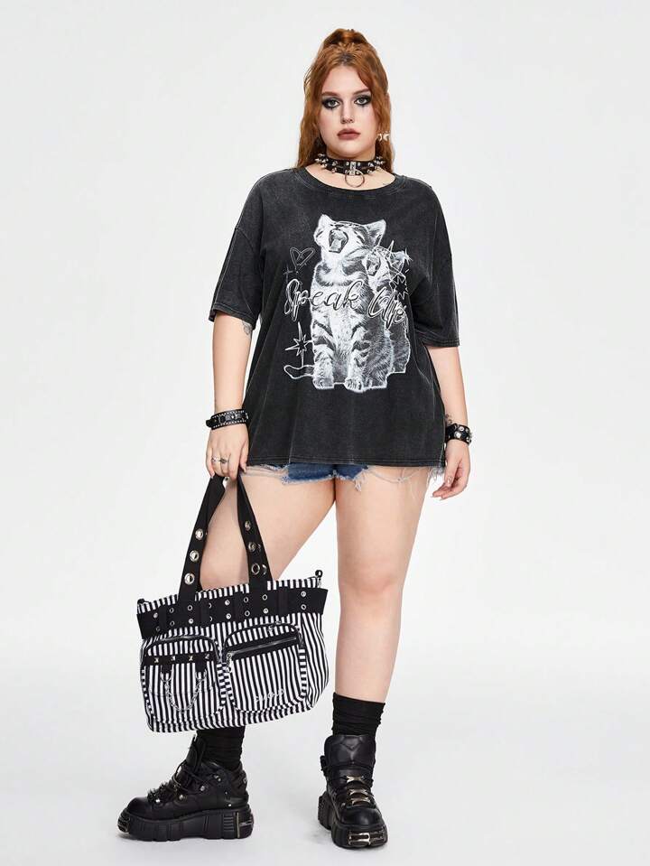Grunge Punk Plus Size Vintage Washed Snowflake Fabric Funny Cat Printed Loose Fit Summer T-Shirt, School