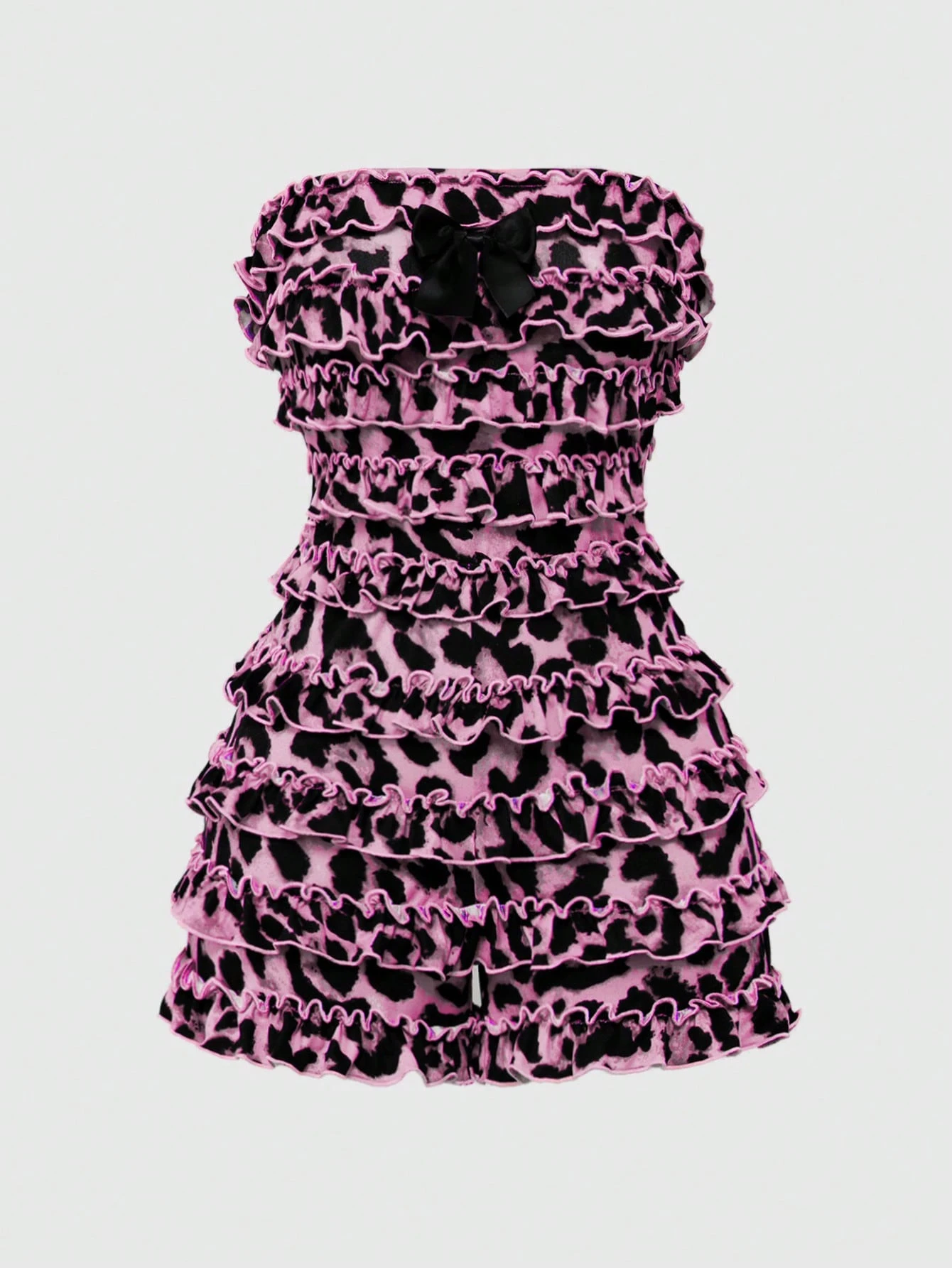 Grunge Punk Plus Size Women Summer Y2K Harajuku Gyaru Outfit Leopard Print Multi-Layer Ruffle Trim Cake Romper