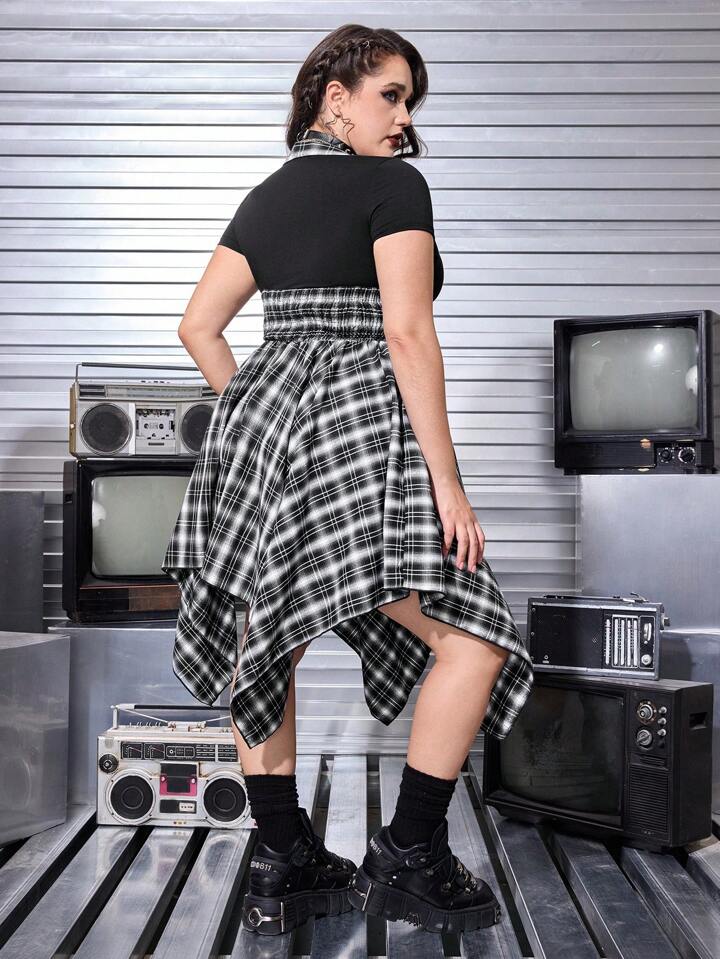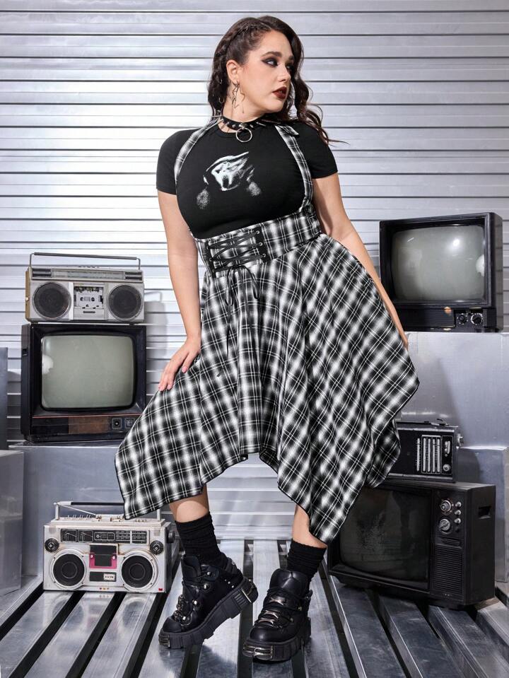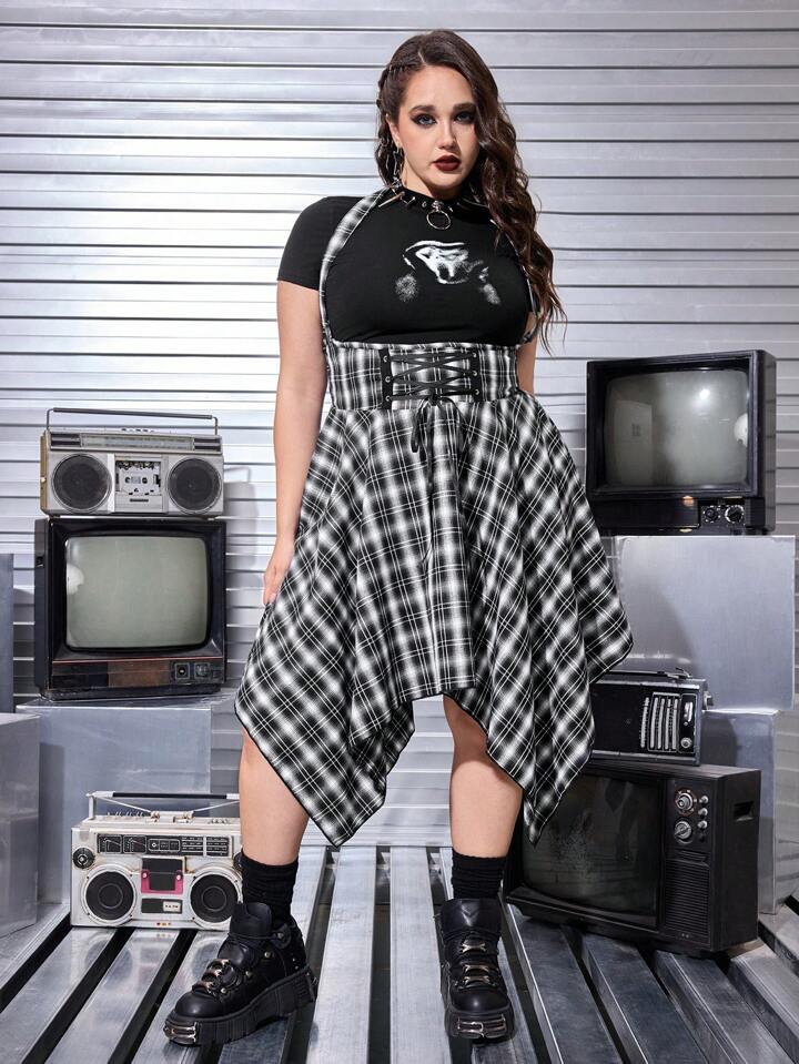 Grunge Punk Plus Size Women's Summer Music Festival Black & White Checked Waist Tie Strap Asymmetrical Hem Dress