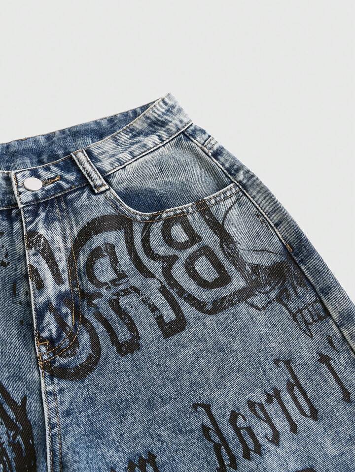 Grunge Punk Plus Size Women's Vintage Washed Denim Pants With Butterfly & Skull Print And Slogan, School