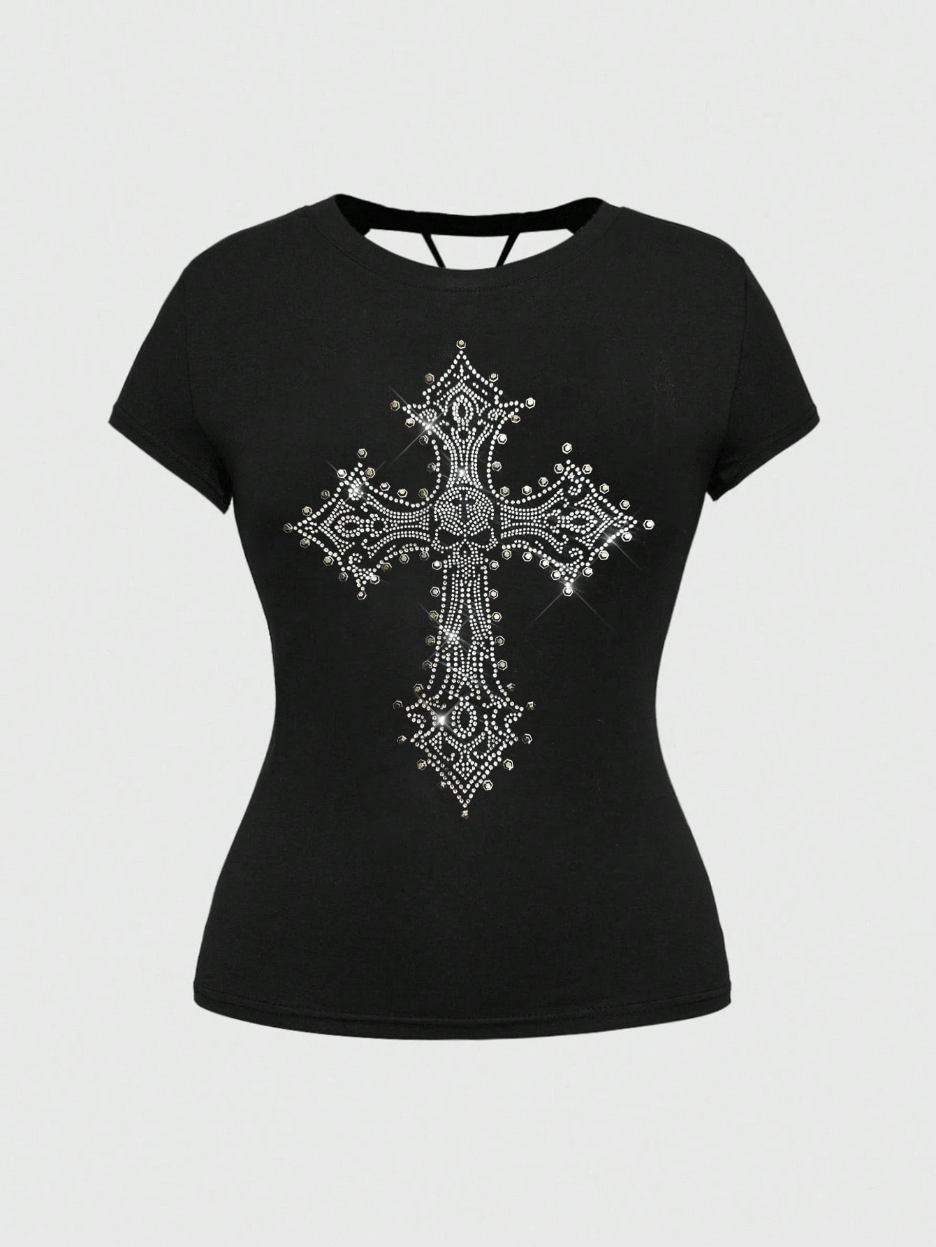 Grunge Punk Plus Size Y2K Punk Skull Cross Rivet Hollow Back Graphic Slim Fit Solid Color Versatile T-Shirt