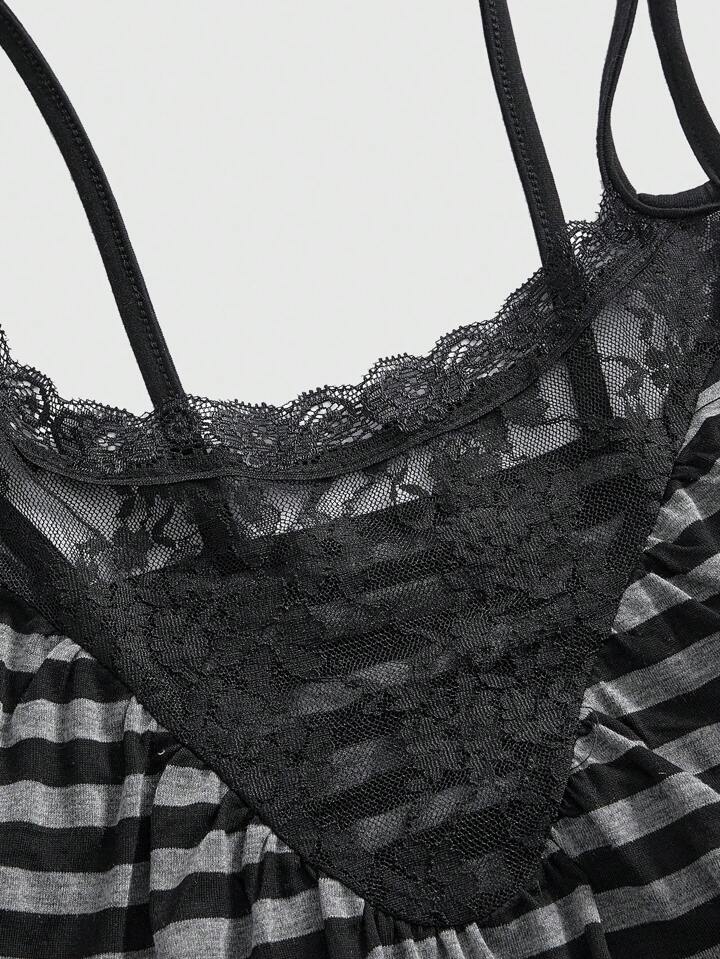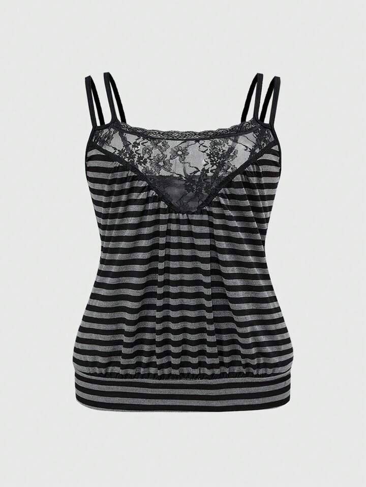 Grunge Punk Plus Size Y2K Style Striped Contrast Lace Trim Draped Neck Camisole, Suitable For Music Festival