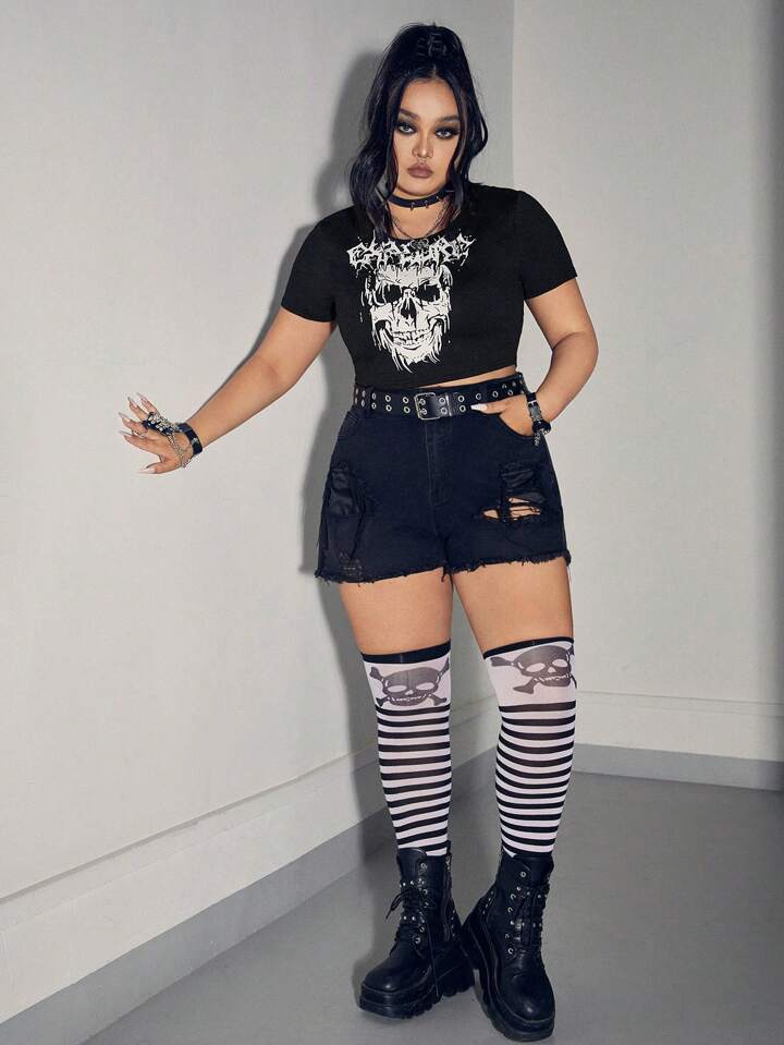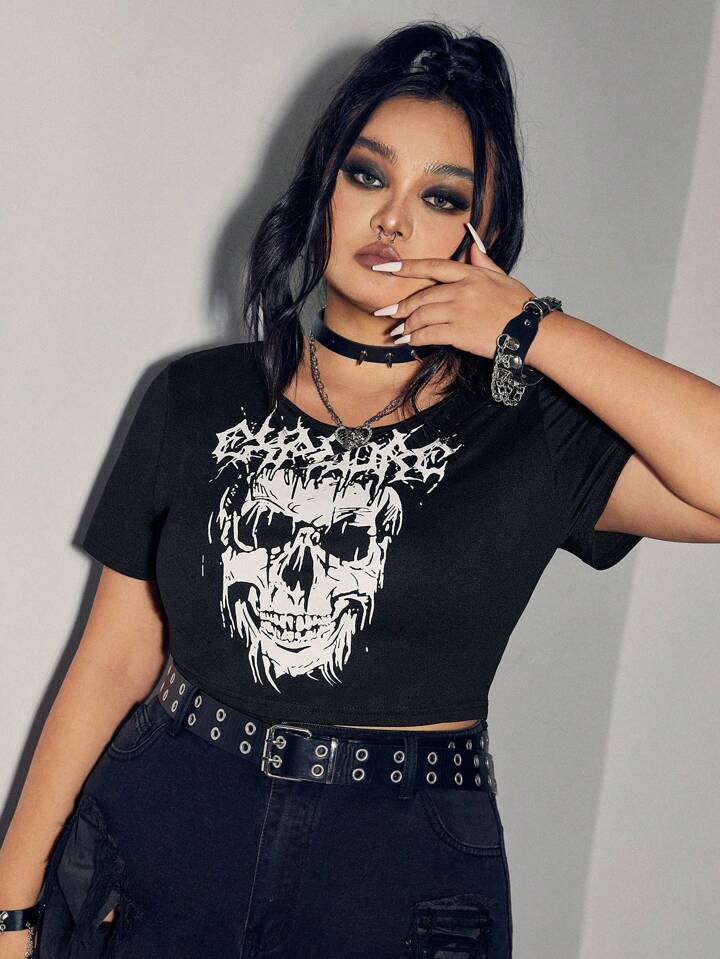 Grunge Punk Plus Skull & Letter Graphic Crop Tee