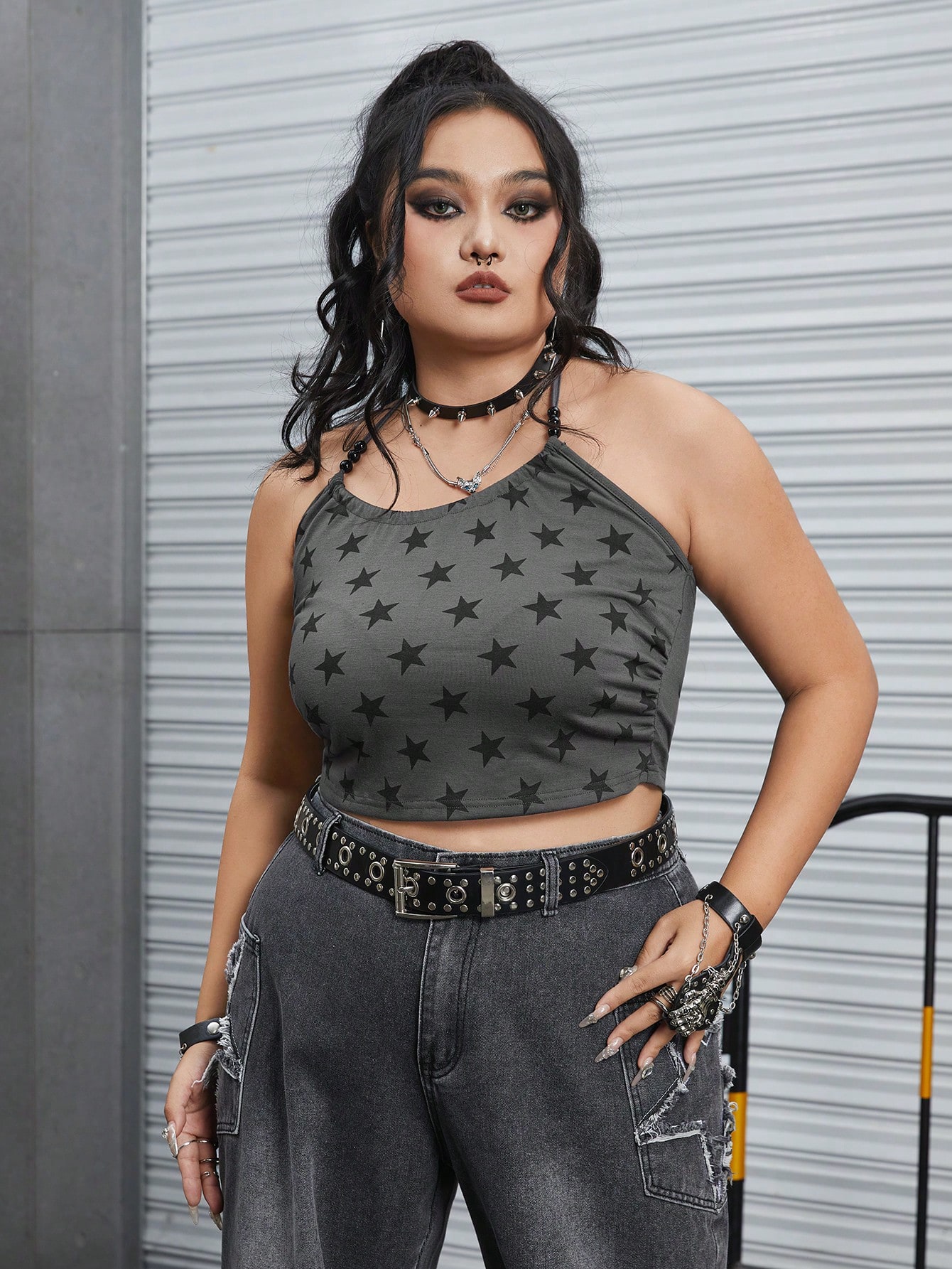 Grunge Punk Plus Star Print Crop Halter Top