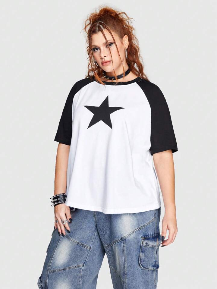 Grunge Punk Plus Star Print Raglan Sleeve Tee