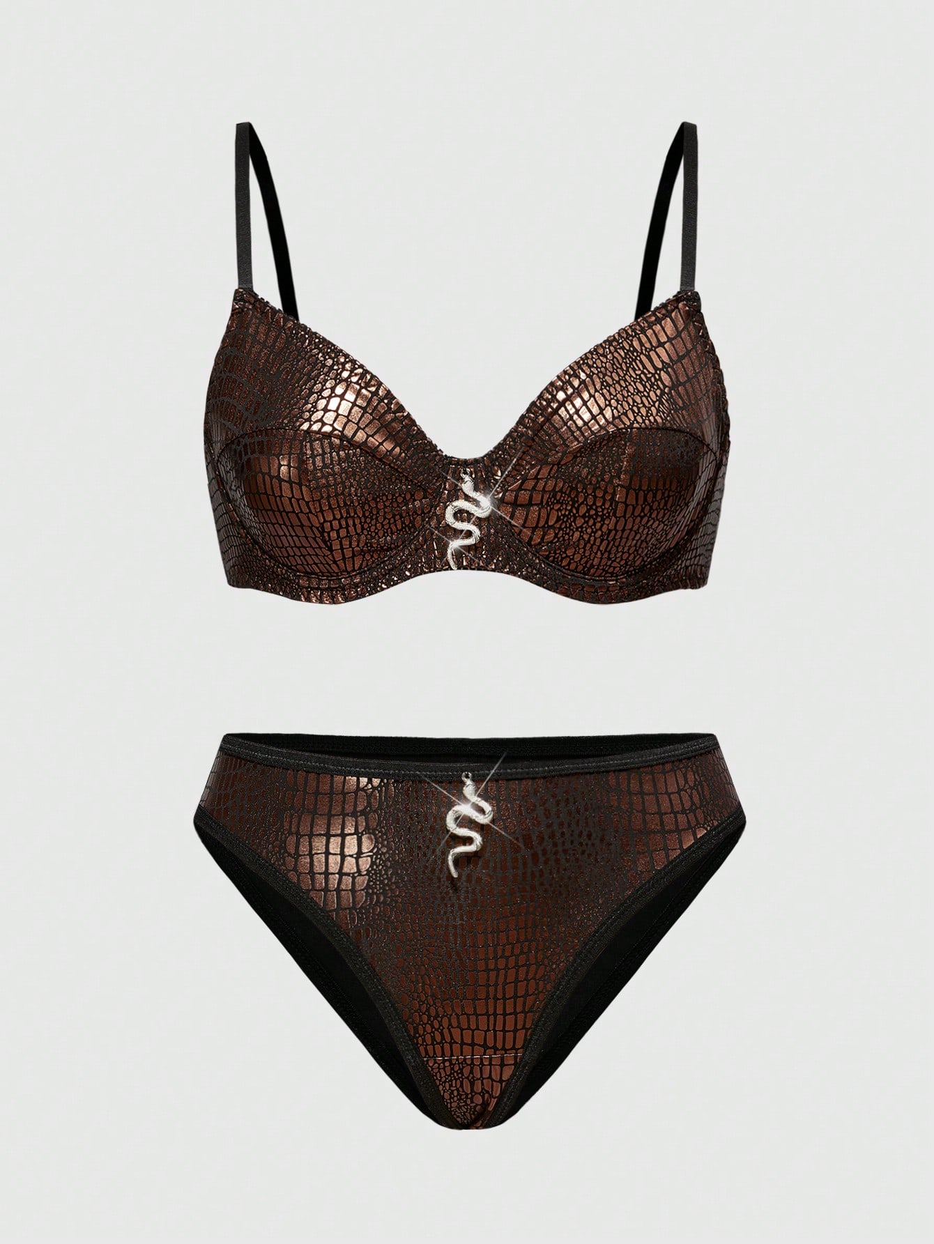 Grunge Punk Punk Metal Coated Fabric Push-Up Bra And Thong Panties Set With Snake Pendant Accessory