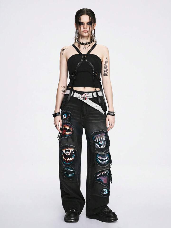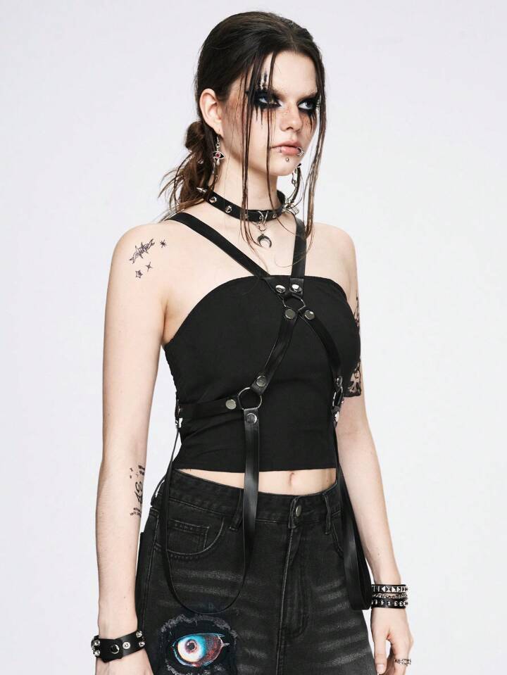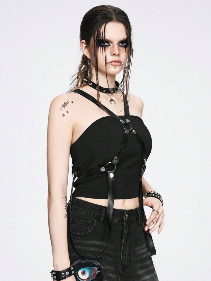 Grunge Punk Punk Motorcycle Style Solid Color Crossed PU Ribbon And O-Ring Spaghetti Strap Top For Women