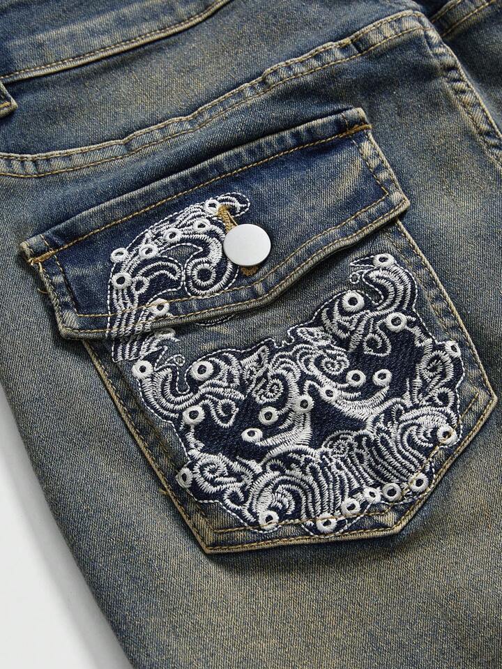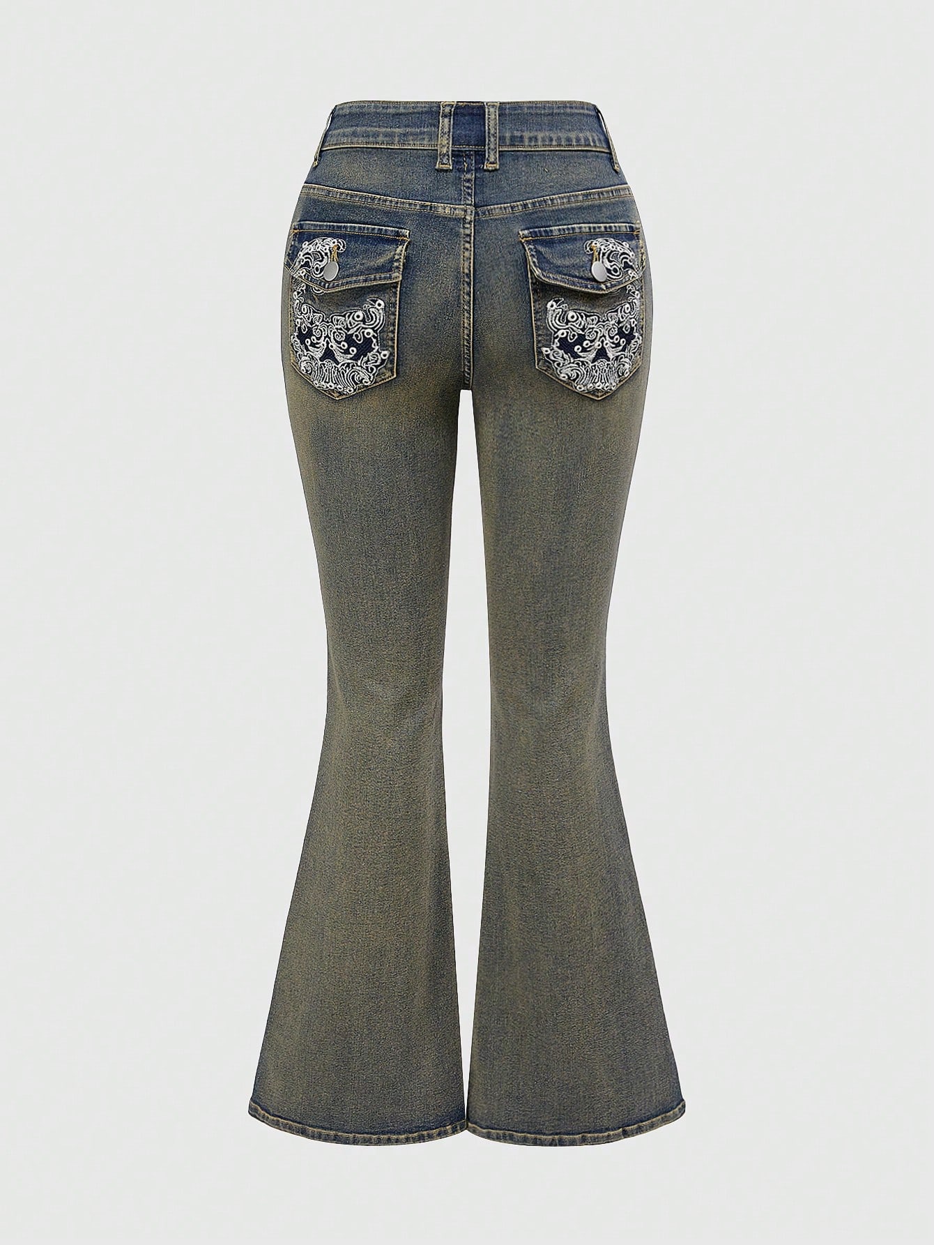 Grunge Punk Punk Skeleton Head Embroidered Slim Fit Flare Leg Women Jeans
