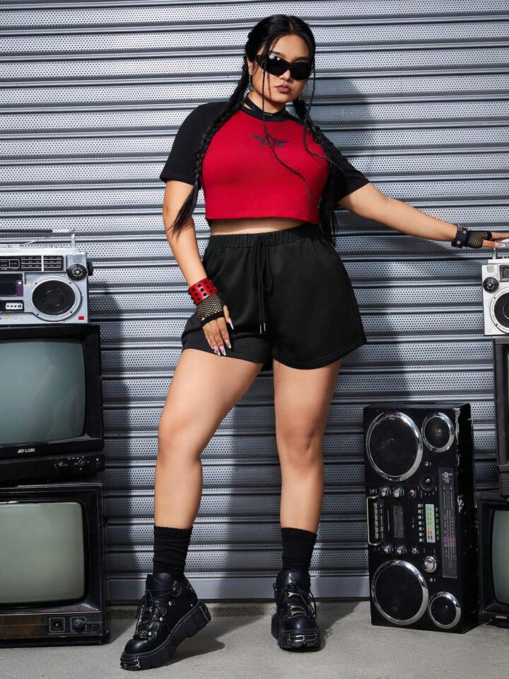 Grunge Punk Punk Skull Printed Rhinestone Cross Printed Plus Size Hoodie And Shorts Set, School