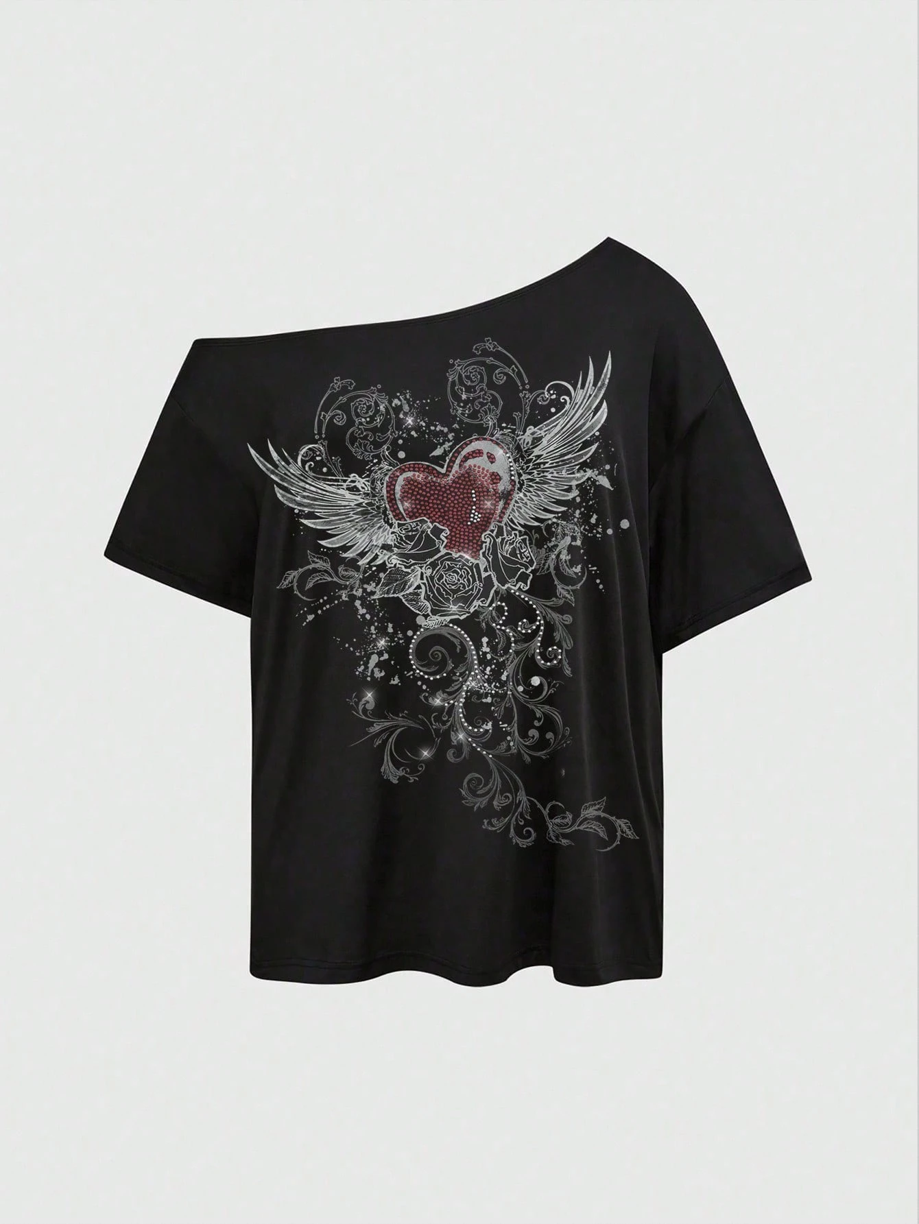 Grunge Punk Punk Style Heart Wing Graphic Sexy Asymmetric Shoulder Black Solid Basic Casual Street Vintage Loose Fit Plus Size Cropped T-Shirt, Summer