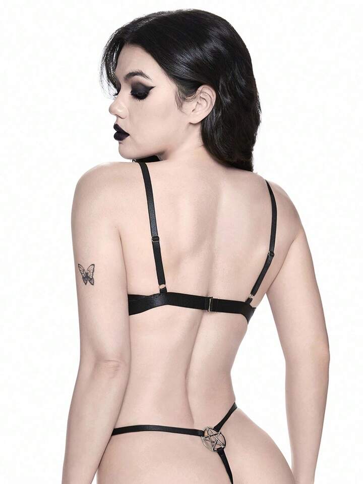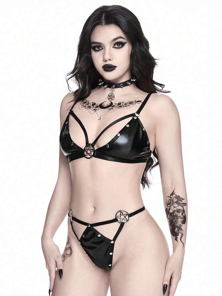 Grunge Punk Punk Style PU Studded Triangle Bra And G-String Lingerie Set, Sexy