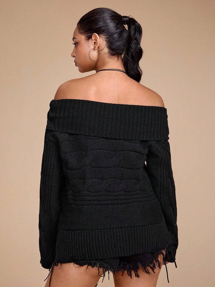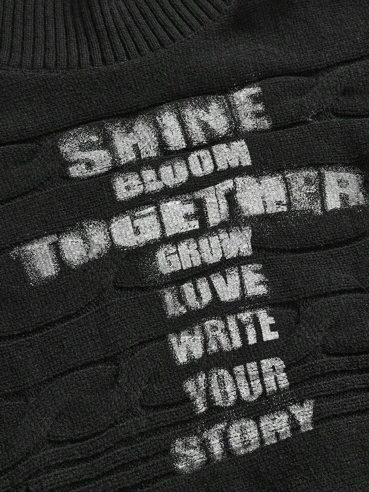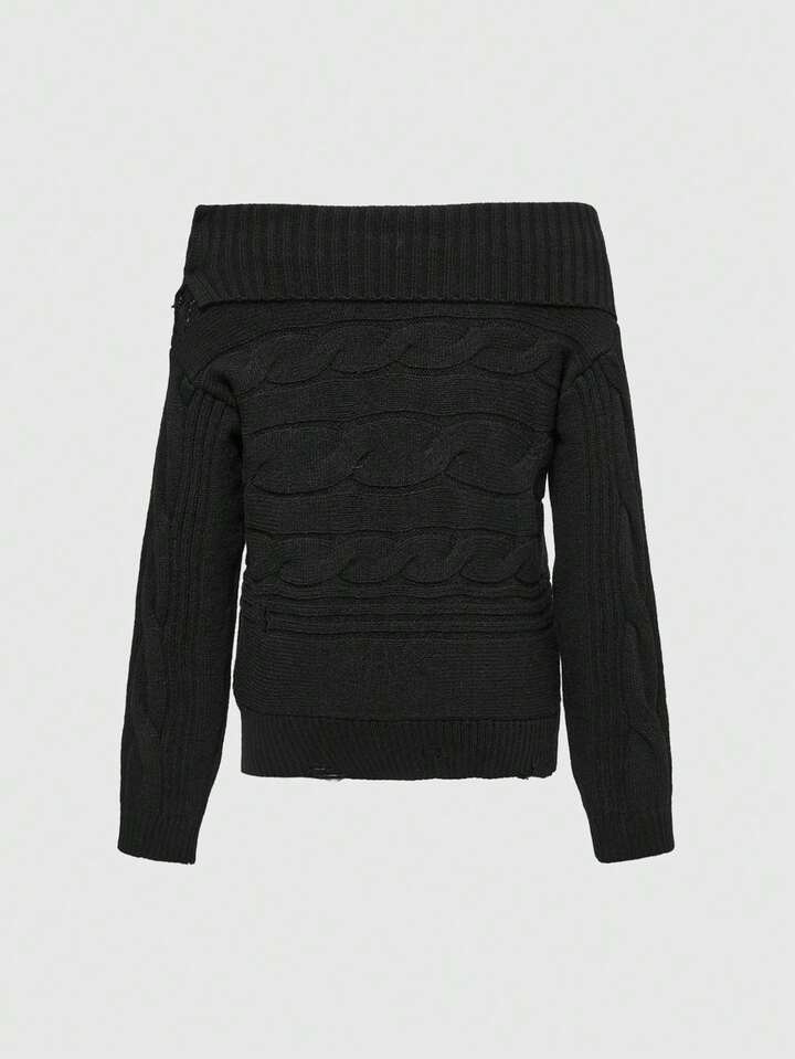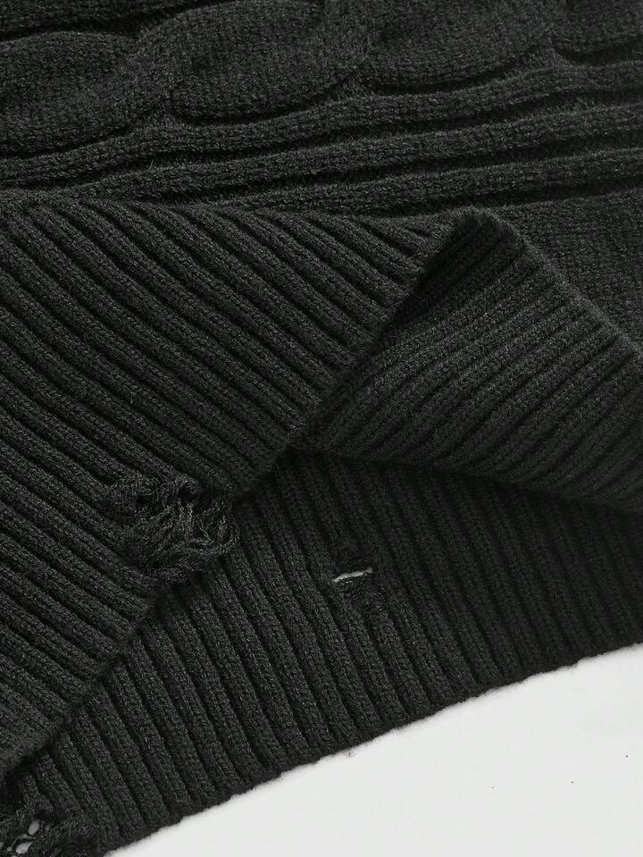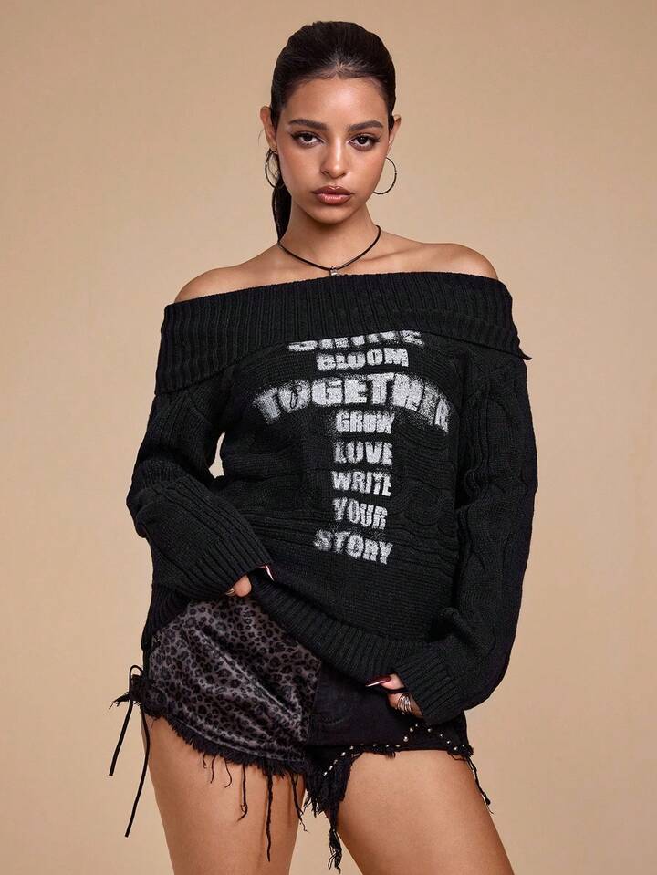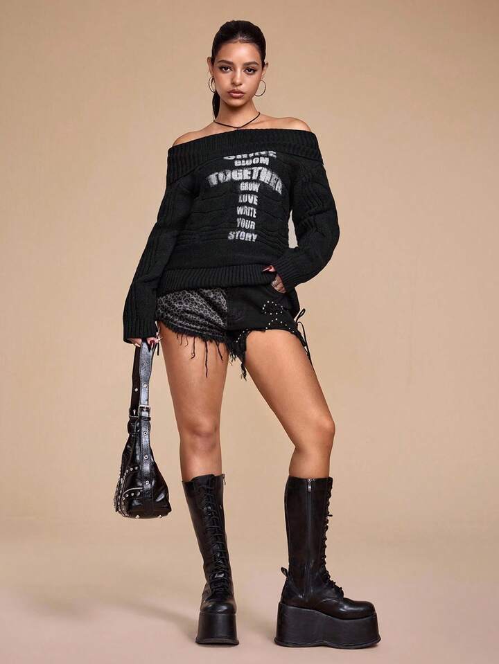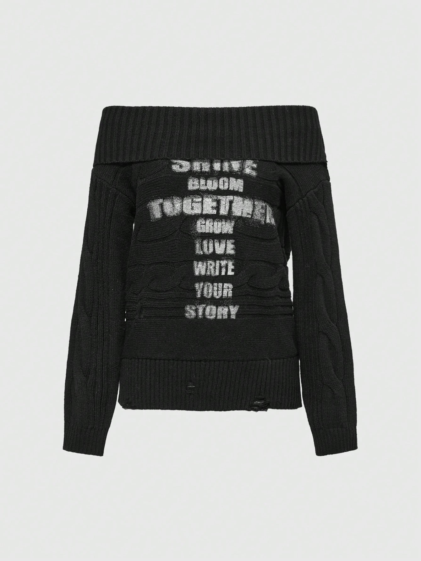 Grunge Punk Punk Style Turtleneck Distressed Collar Oblique Shoulder Twist Knit Loose Cross Print Women Sweater