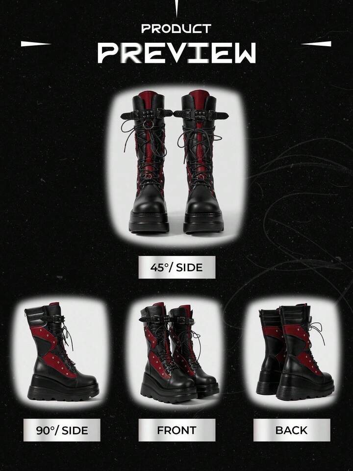 Grunge Punk Red & Black Metal Buckle Platform Mid-Calf Lace-Up Punk Knee-High Boots For Christmas
