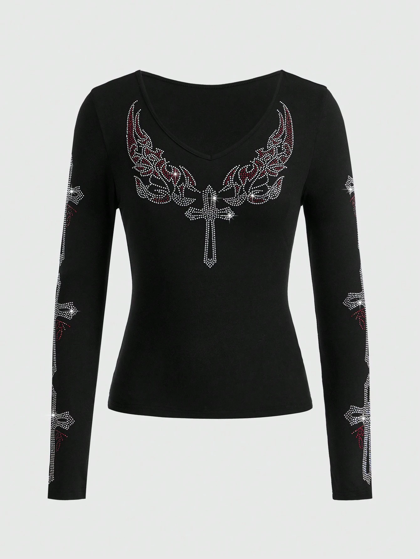 Grunge Punk Rhinestone Cross Pattern V Neck Tee