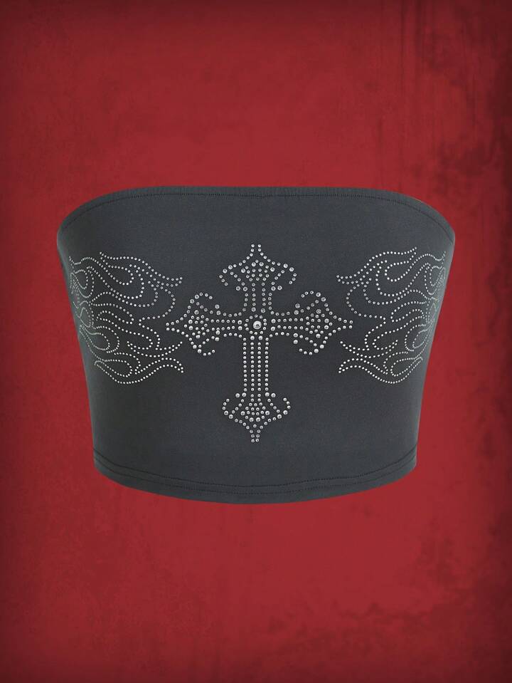 Grunge Punk Rhinestone Decor Cross Print Crop Tube Top