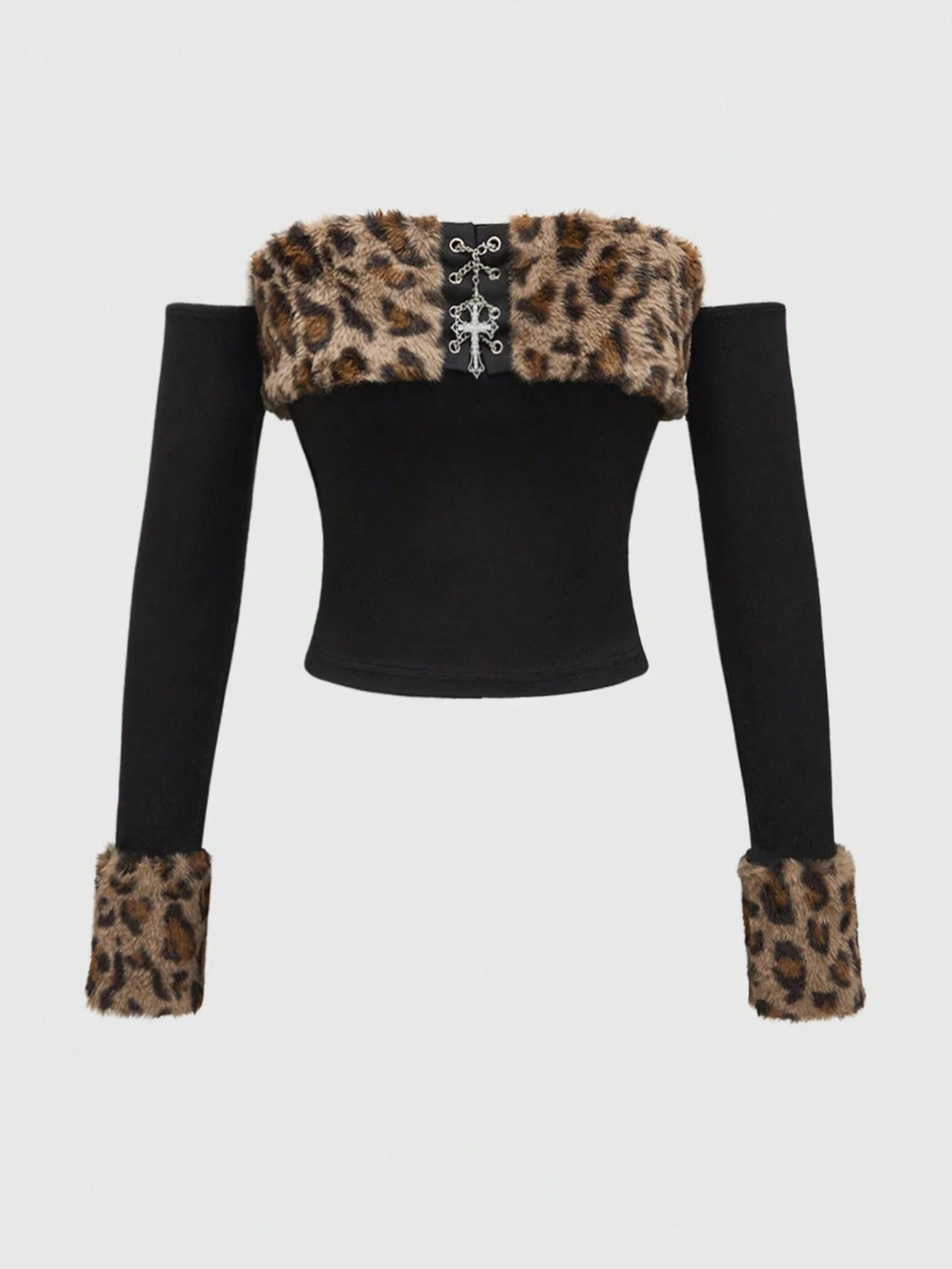Grunge Punk Sexy Leopard Patchwork Fur Collar Sleeveless Crop Top For Women, Vintage Y2K Style