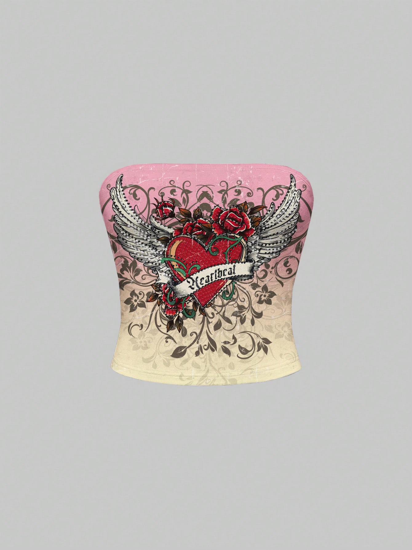 Grunge Punk Sexy Strapless Beach Heart Wing Tie Dye Design Women Crop Top For Vacation