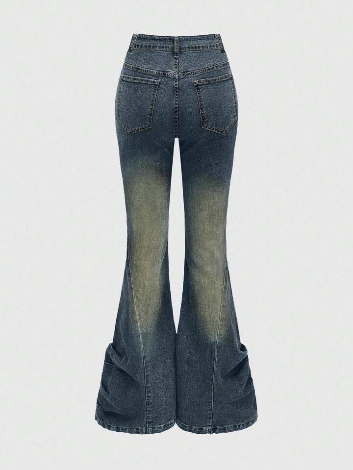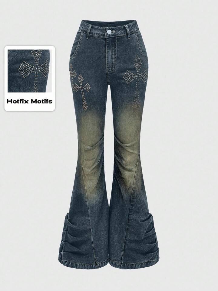 Grunge Punk Shibuya Girl Subculture Y2K Kpop Retro Cross Metal Stud Skinny Distressed Flare Low Waist Jeans For Women