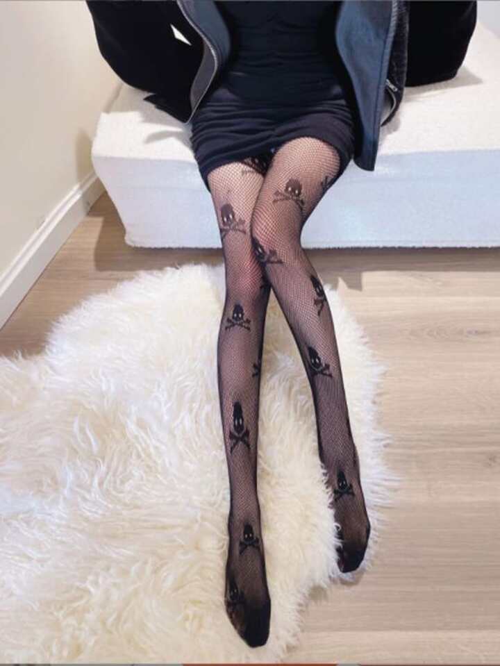 Grunge Punk Skeleton Graphic Fishnet Tights