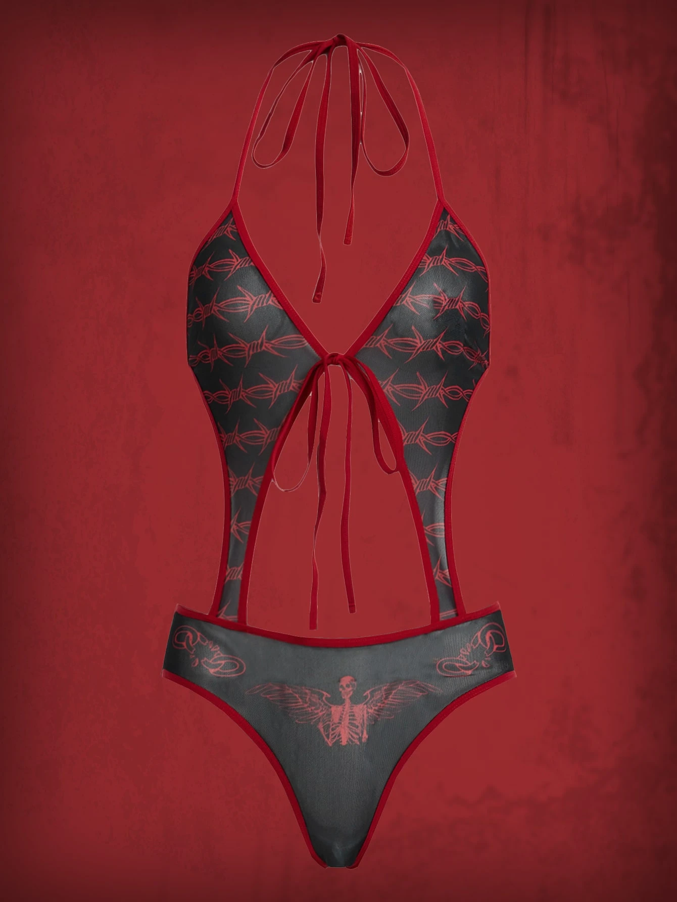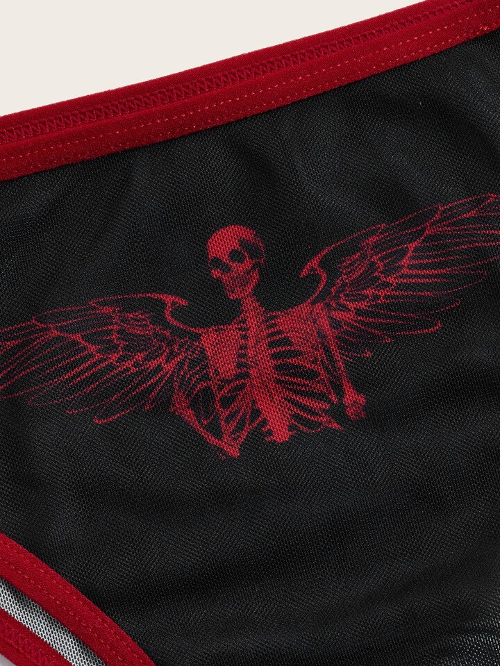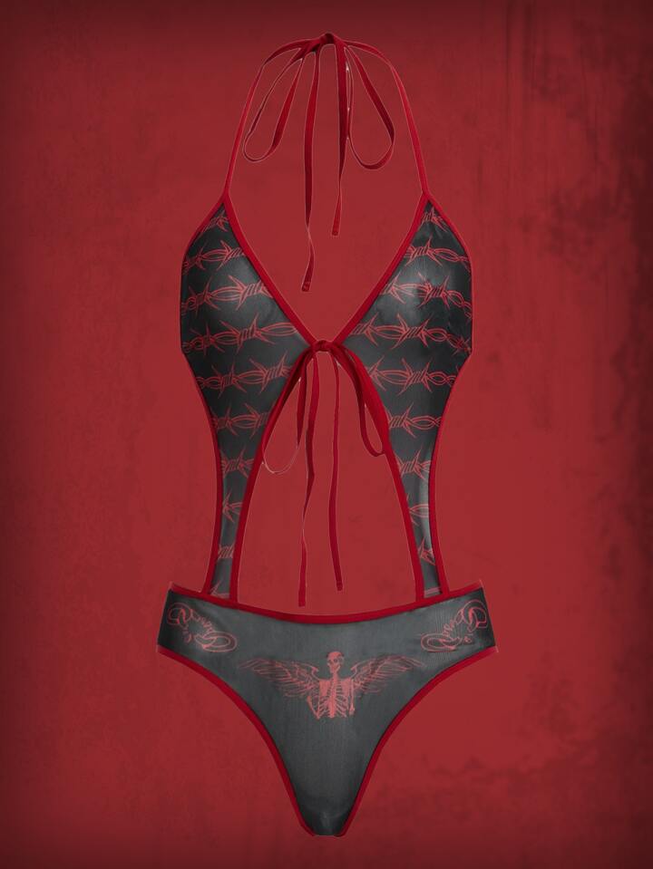 Grunge Punk Skull Graphic Contrast Binding Cut Out Teddy Bodysuit