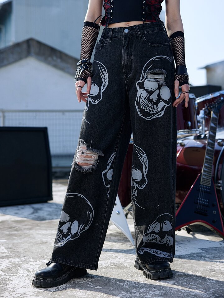 Grunge Punk Skull Print Ripped Wide Leg Jeans