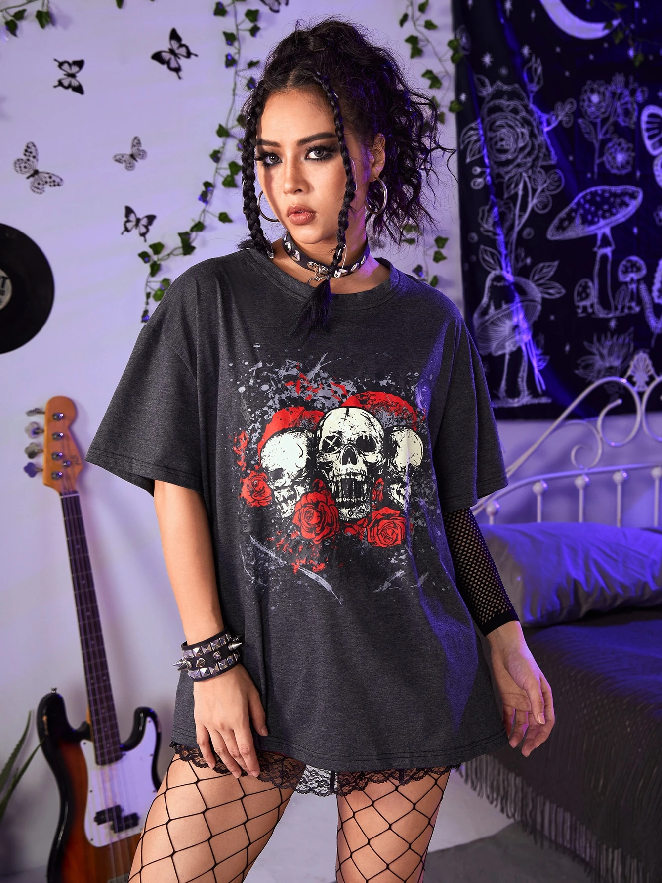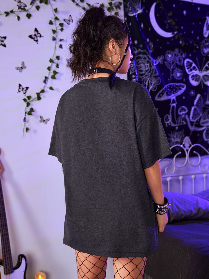 Grunge Punk Skull & Rose Print Oversized Tee