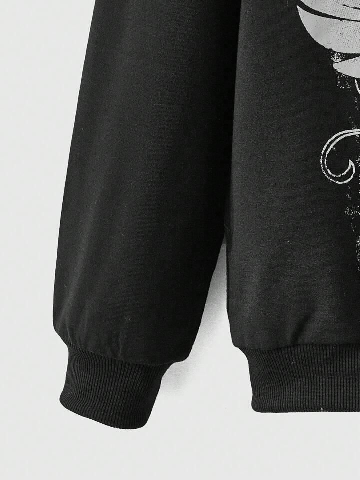 Grunge Punk Skull & Wings Printed Hooded Sweatshirt With Drawstring Closure