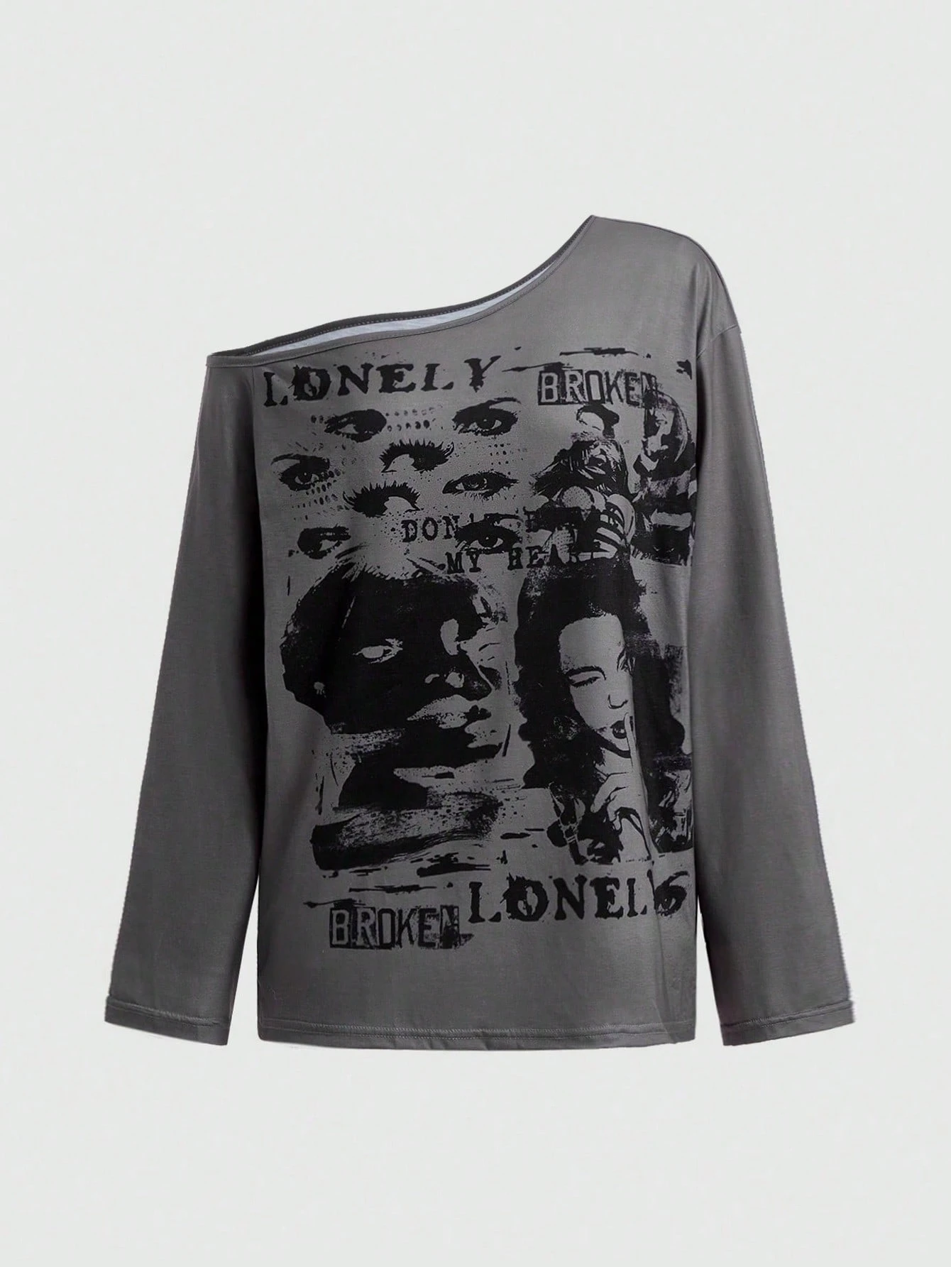 Grunge Punk Slogan & Figure Graphic Asymmetrical Neck Tee